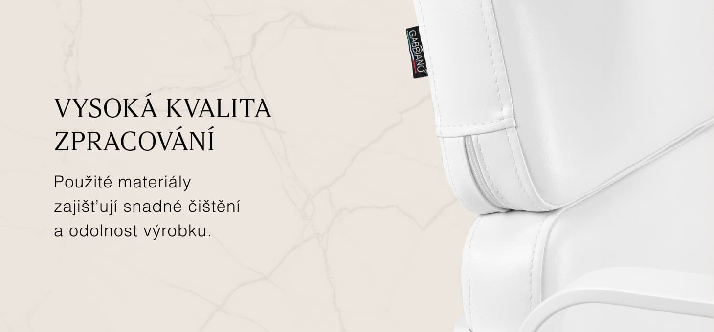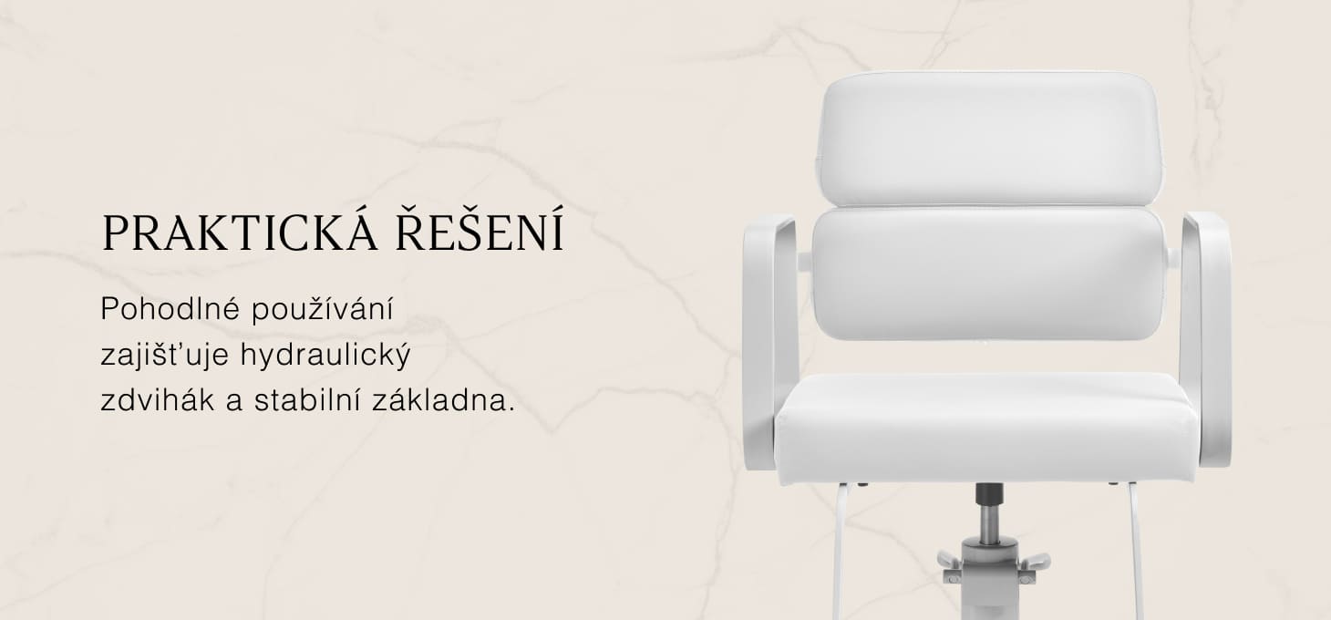 Polstrování z odolné pěny odolné proti deformacím a čalounění z na dotek příjemné syntetické kůže zajišťují odolnost nábytku a jeho pohodlné používání po dlouhou dobu. Díky nim je také odolný proti vlhkosti, trvanlivý a snadno se čistí. Potah v bílých tónech mu dodává jedinečný charakter. Zařízení se vyznačuje moderním designem, díky němuž se křeslo skvěle vyjímá v mnoha profesionálních salonech.