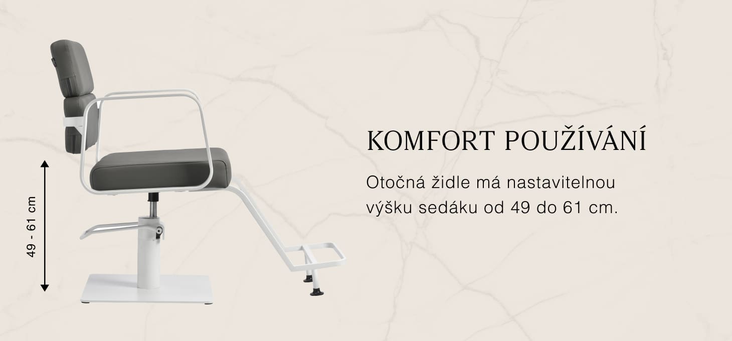 Odolný hydraulický zvedák umožňuje nastavit výšku sedadla v rozmezí 49-61 cm - a to i v případě, že klient na židli sedí. Poskytuje ergonomičtější pracovní prostředí, protože umožňuje nastavit úroveň sedadla podle výšky klienta i kadeřníka. Vizuálně zajímavé opěradlo umožňuje pohodlnou polohu a poskytuje vynikající oporu zad, což je důležité zejména při několikahodinových ošetřeních. Velkým plusem tohoto modelu je otvor ponechaný mezi opěradlem a sedákem. Usnadňuje udržování čistoty v salonu, protože umožňuje snadné vymetení vlasů ze všech koutů křesla. To umožňuje efektivnější přípravu pracoviště mezi jednotlivými klienty.