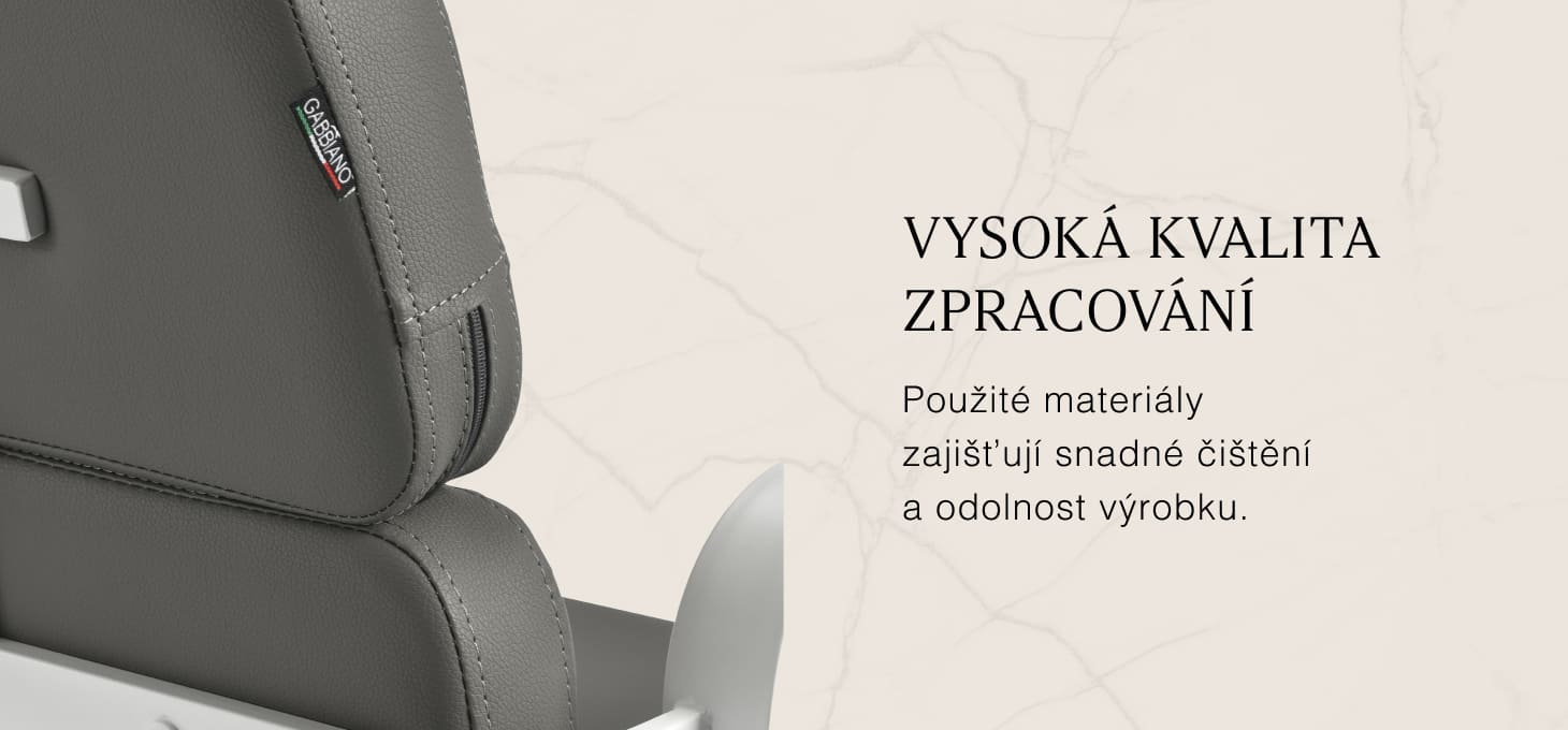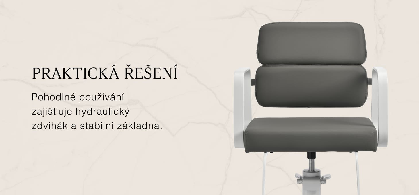 Polstrování z odolné pěny odolné proti deformacím a čalounění z na dotek příjemné syntetické kůže zajišťují odolnost nábytku a jeho pohodlné používání po dlouhou dobu. Díky nim je také odolný proti vlhkosti, trvanlivý a snadno se čistí. Potah v šedých tónech mu dodává jedinečný charakter. Zařízení se vyznačuje moderním designem, díky němuž se křeslo skvěle vyjímá v mnoha profesionálních salonech.