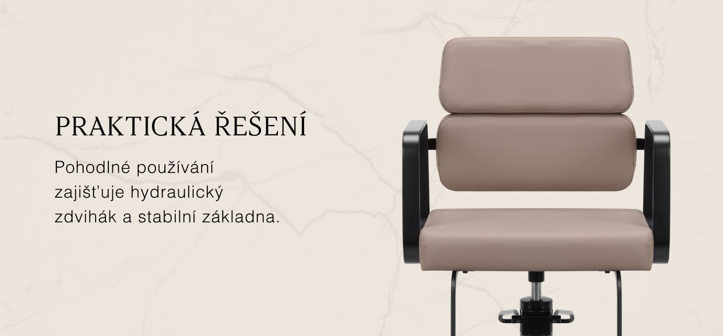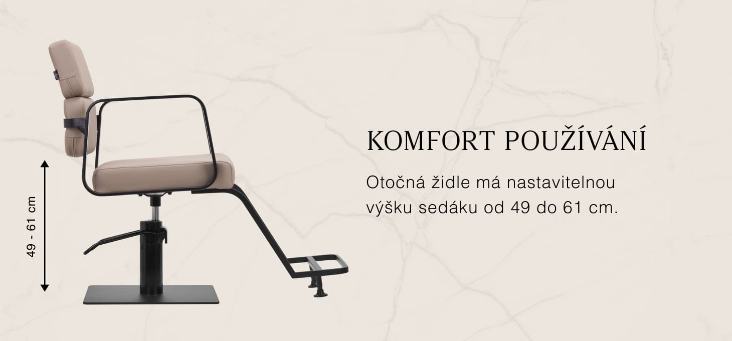Odolný hydraulický zvedák umožňuje nastavit výšku sedadla v rozmezí 49-61 cm - a to i v případě, že klient na židli sedí. Poskytuje ergonomičtější pracovní prostředí, protože umožňuje nastavit úroveň sedadla podle výšky klienta i kadeřníka. Vizuálně zajímavé opěradlo umožňuje pohodlnou polohu a poskytuje vynikající oporu zad, což je důležité zejména při několikahodinových ošetřeních. Velkým plusem tohoto modelu je otvor ponechaný mezi opěradlem a sedákem. Usnadňuje udržování čistoty v salonu, protože umožňuje snadné vymetení vlasů ze všech koutů křesla. To usnadňuje přípravu pracoviště mezi jednotlivými klienty.