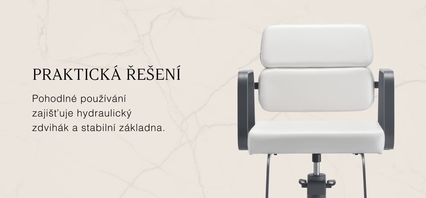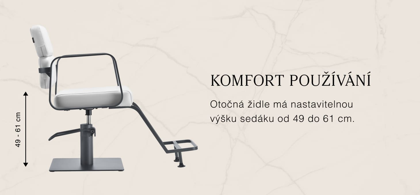 Odolný hydraulický zvedák umožňuje nastavit výšku sedadla v rozmezí 49-61 cm - a to i v případě, že klient na židli sedí. Poskytuje ergonomičtější pracovní prostředí, protože umožňuje nastavit úroveň sedadla podle výšky klienta i kadeřníka. Vizuálně zajímavé opěradlo umožňuje pohodlnou polohu a poskytuje vynikající oporu zad, což je důležité zejména při několikahodinových ošetřeních. Velkým plusem tohoto modelu je otvor ponechaný mezi opěradlem a sedákem. Usnadňuje udržování čistoty v salonu, protože umožňuje snadné vymetení vlasů ze všech koutů křesla. To umožňuje efektivnější přípravu pracoviště mezi jednotlivými klienty.