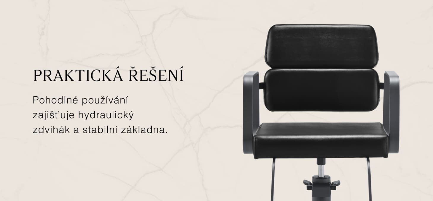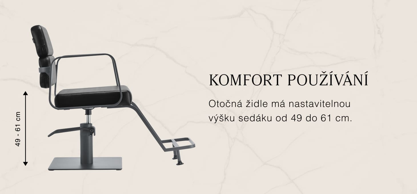 Odolný hydraulický zvedák umožňuje nastavit výšku sedadla v rozmezí 49-61 cm - a to i v případě, že klient na židli sedí. Poskytuje ergonomičtější pracovní prostředí, protože umožňuje nastavit úroveň sedadla podle výšky klienta i kadeřníka. Vizuálně zajímavé opěradlo umožňuje pohodlnou polohu a poskytuje vynikající oporu zad, což je důležité zejména při několikahodinových ošetřeních. Velkým plusem tohoto modelu je otvor ponechaný mezi opěradlem a sedákem. Usnadňuje udržování čistoty v salonu, protože umožňuje snadné vymetení vlasů ze všech koutů křesla. To umožňuje efektivnější přípravu pracoviště mezi jednotlivými klienty.