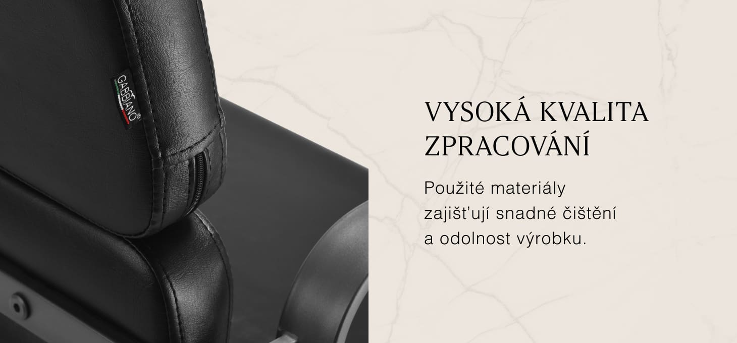 Polstrování z odolné pěny odolné proti deformacím a čalounění z na dotek příjemné syntetické kůže zajišťují odolnost nábytku a jeho pohodlné používání po dlouhou dobu. Díky nim je také odolný proti vlhkosti, trvanlivý a snadno se čistí. Potah v černých tónech mu dodává jedinečný charakter. Zařízení se vyznačuje moderním designem, díky němuž se křeslo skvěle vyjímá v mnoha profesionálních salonech.