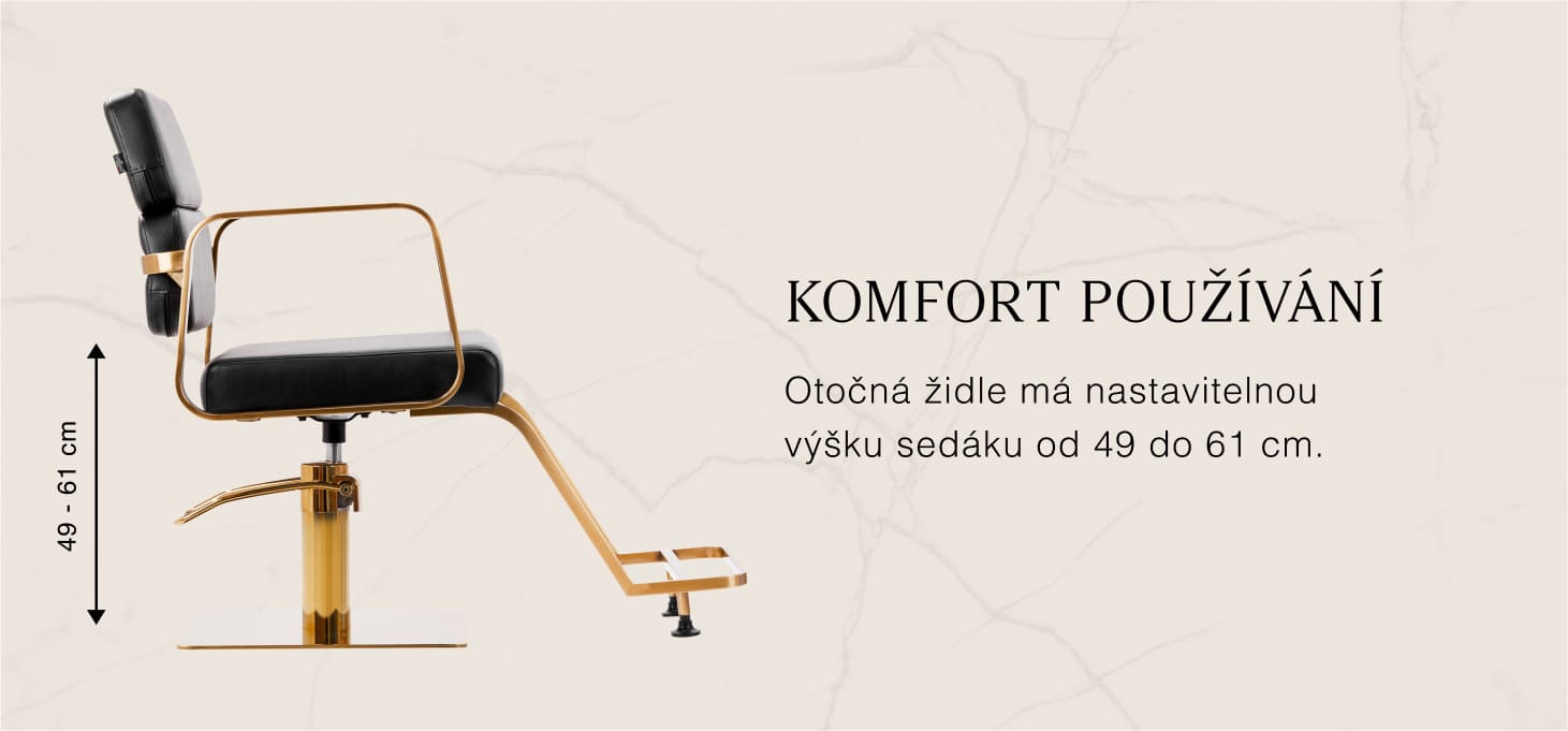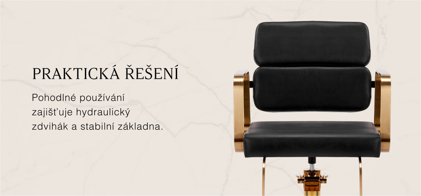 Mechanismus plného otáčení, kterým je křeslo vybaveno, zefektivňuje a zpříjemňuje práci kadeřníka. Pevná plochá základna čtvercového tvaru zaručuje stabilitu při používání. Matný hladký povrch dodává židli elegantní vzhled a díky němu se tato snadno udržuje v čistotě. Pohodlné sedadlo s pěnovou výplní zajišťuje vysokou úroveň komfortu i při dlouhém používání. Geometrické kovové područky ve zlatých tónech umožňují správnou polohu ramen klienta - zajišťují, aby nezakopával hlavu do paží a nehrbil se - a znatelně tak usnadňují precizní ošetření, včetně stříhání vlasů. Stylová opěrka nohou určená pro tento model poskytuje stabilní oporu pro nohy uživatele.