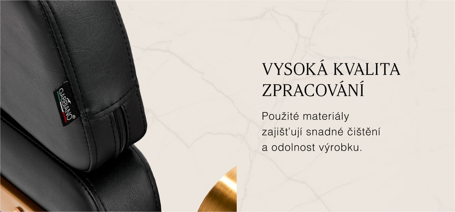 Polstrování z odolné pěny odolné proti deformacím a čalounění z na dotek příjemné syntetické kůže zajišťují odolnost nábytku a jeho pohodlné používání po dlouhou dobu. Díky nim je také odolný proti vlhkosti, trvanlivý a snadno se čistí. Potah v odstínech černé barvy mu dodává jedinečný charakter. Zařízení se vyznačuje moderním designem, díky němuž se křeslo skvěle vyjímá v mnoha profesionálních salonech.