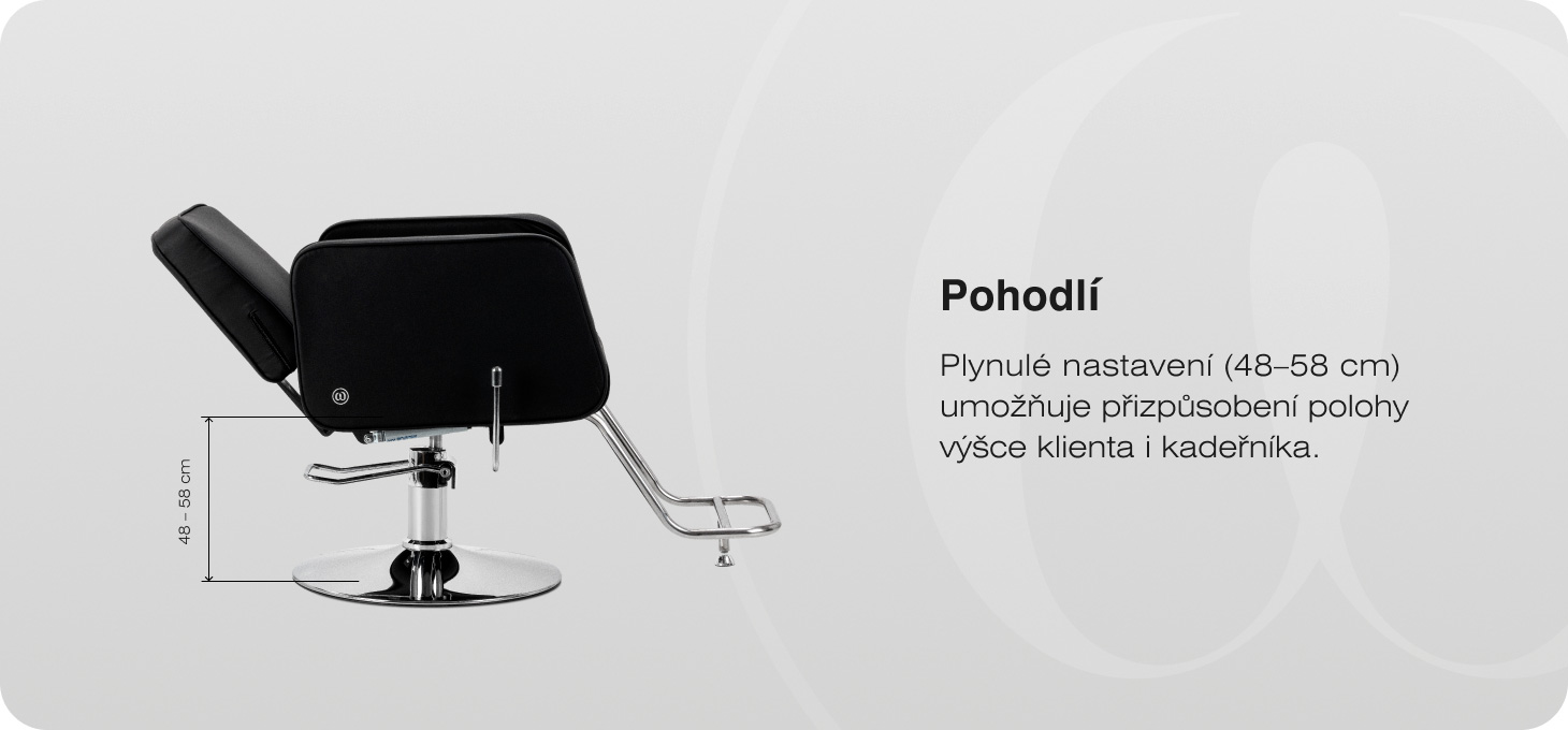 Odolný hydraulický zvedák umožňuje plynulé nastavení výšky sedáku v rozmezí 48–58 cm, a to i během používání křesla. Toto řešení podporuje ergonomii práce, což umožňuje snadné přizpůsobení polohy výšce klienta i kadeřníka. Správně tvarované opěradlo zajišťuje stabilní oporu zad a napomáhá udržet pohodlnou polohu i během delších procedur. Integrovaná opěrka nohou zvyšuje komfort používání a zajišťuje stabilní oporu pro chodidla.