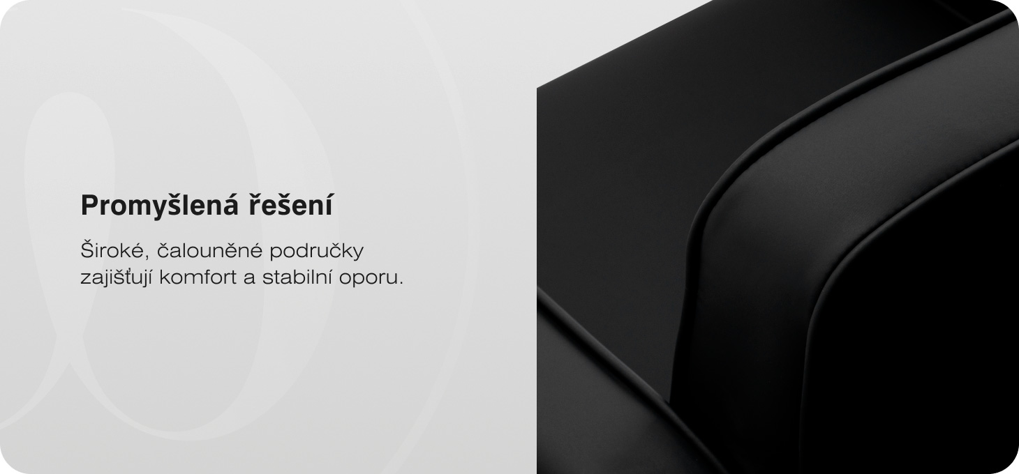 Široké, čalouněné područky podporují přirozené držení paží, zvyšují pohodlí při sezení a stabilizují polohu zákazníka. Mechanismus plného otočení zvyšuje volnost práce a usnadňuje provádění procedur z různých stran křesla. Stabilní konstrukce a pevná základna zajišťují bezpečnost a spolehlivou oporu při každodenním používání.