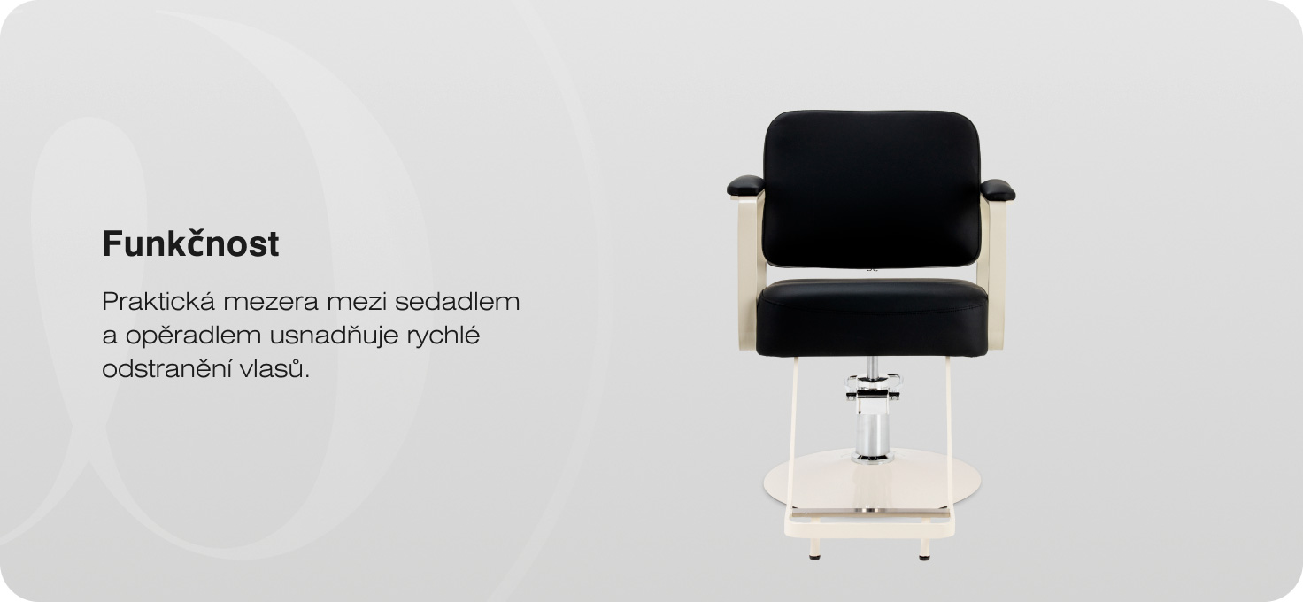 Konstrukce křesla byla navržena s ohledem na pohodlí při mnohodobé práci v salonu. Silné, měkké sedadlo a ergonomické kovové područky, částečně potažené čalouněním, podporují přirozený postoj zákazníka a usnadňují přesné provádění kadeřnických služeb. Mechanismus plného otočení zvyšuje volnost pohybu, což se promítá do plynulejší a efektivnější práce. Praktický prostor mezi sedákem a opěrkou usnadňuje rychlé odstraňování vlasů a pomáhá udržovat pracoviště v čistotě.