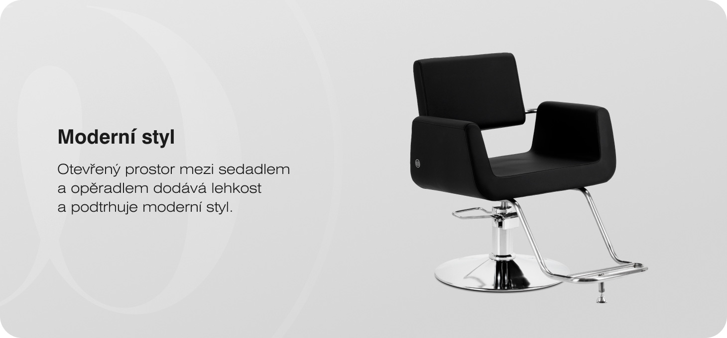 Model se vyznačuje minimalistickým designem inspirovaným moderním stylem. Čalounění z vysoce kvalitní syntetické kůže v klasické černé barvě dodává celku elegantní vzhled a jeho povrch se vyznačuje odolností proti vlhkosti a snadnou údržbou. Podstavec a kovová opěrka pro nohy podtrhují moderní charakter křesla a vytvářejí ucelený a estetický tvar, který se dobře hodí do různých interiérů kadeřnických a holičských salonů.