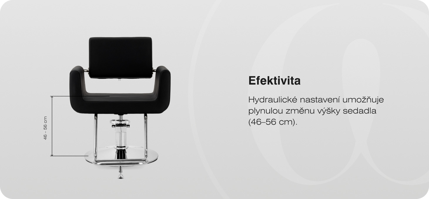 Hydraulický zvedák umožňuje plynulé nastavení výšky sedáku v rozmezí 46–56 cm, a to i během používání křesla. Toto řešení podporuje ergonomii práce a umožňuje snadné přizpůsobení polohy jak výšce zákazníka, tak kadeřníka. Tvarované opěradlo zajišťuje stabilní oporu zad a pohodlnou polohu, což má zvláštní význam při delších procedurách. Přizpůsobená opěrka nohou zajišťuje stabilní oporu pro nohy uživatele a zvyšuje tak pohodlí při sezení.