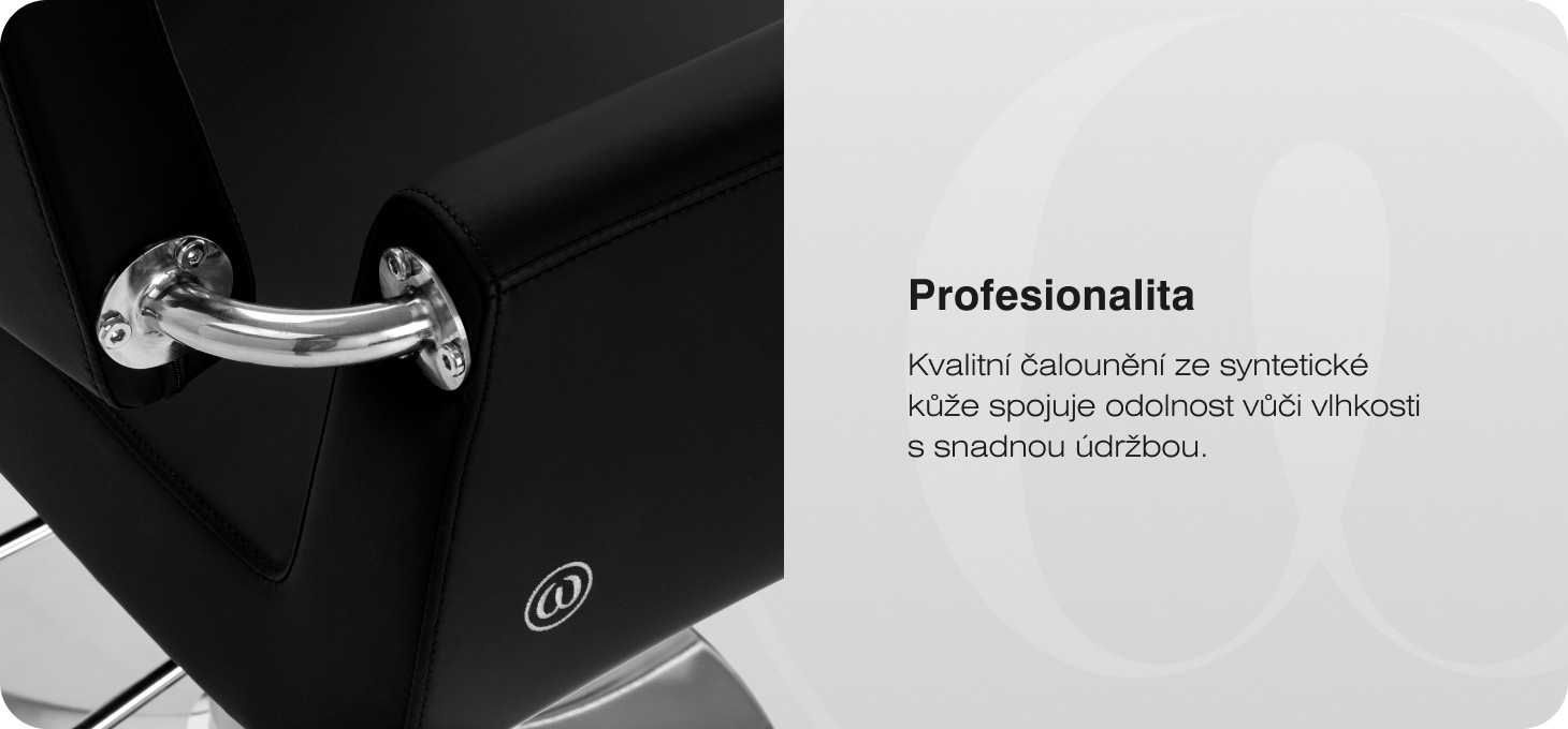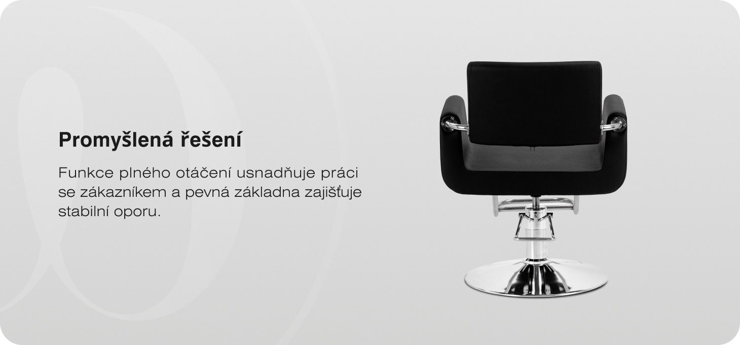 Vhodně tvarované sedadlo a ergonomické čalouněné područky podporují přirozené držení těla zákazníka a zajišťují stabilní oporu a pohodlí. Otevřený prostor mezi sedákem a opěrkou usnadňuje udržování čistoty pracoviště a umožňuje rychlé odstranění vlasů. Mechanismus plného otočení zvyšuje volnost práce a usnadňuje provádění procedur z různých stran křesla. Stabilní podstavec zajišťuje bezpečnost a jistou oporu při každodenním používání.