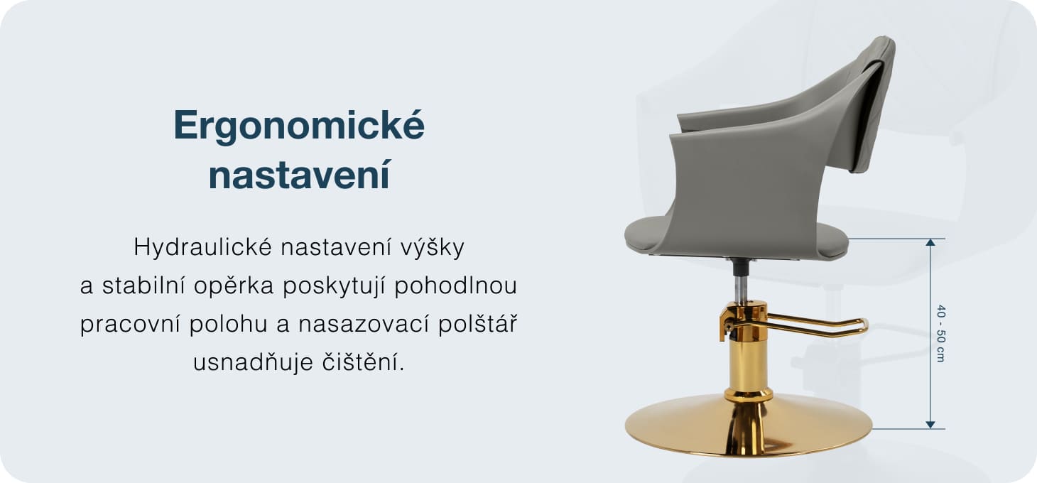 Odolný hydraulický zdvih umožňuje nastavit výšku sedadla v rozmezí 40-50 cm - a to i během používání. Díky tomu lze židli přizpůsobit výšce klienta a preferencím kadeřníka, což podporuje ergonomickou pracovní polohu. Opěradlo poskytuje stabilní oporu zad, což je užitečné zejména při dlouhých ošetřeních. Pro větší pohodlí je židle vybavena polštářem potaženým syntetickou kůží a připevněným suchým zipem - řešení, které usnadňuje čištění a údržbu.