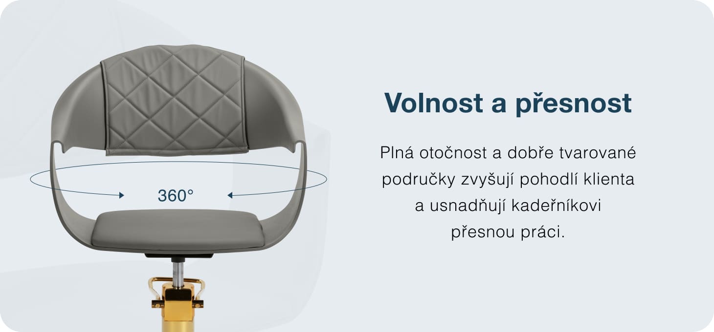 Židle je vybavena plně otočným mechanismem, který kadeřníkovi poskytuje volnost pohybu a pohodlí při práci. Plastové područky umístěné ve správné výšce umožňují správnou polohu ramen klienta a zabraňují hrbení a zaklánění hlavy. Ergonomický design usnadňuje provádění přesných procedur, zatímco robustní povrchová úprava zvyšuje odolnost a pohodlí křesla - pro kratší i delší služby.