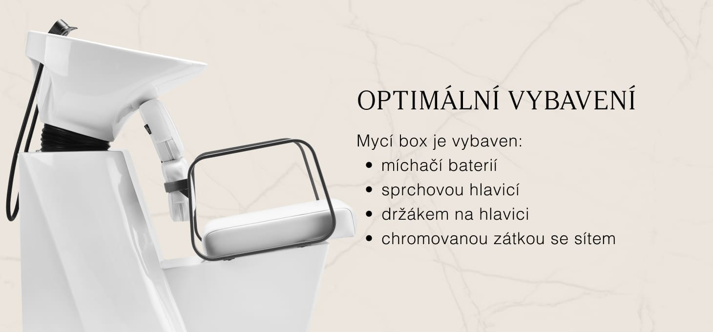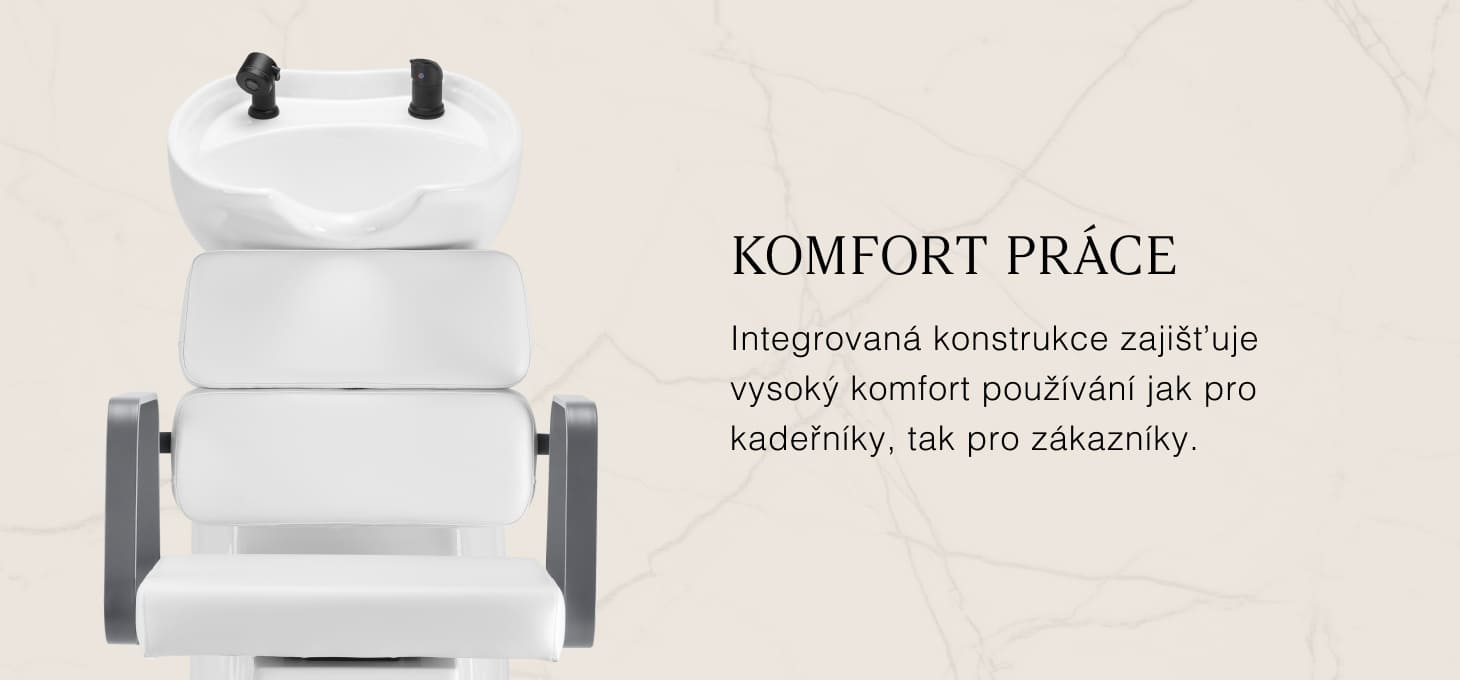 Praktická myčka vlasů je vybavena směšovací baterií, která poskytuje volný přístup k teplé a studené vodě. Díky tomu lze snadno přizpůsobit teplotu individuálním preferencím zákazníka. Vyhrazené místo pro odložení sluchátka zefektivňuje práci a chromovaná zátka se speciálním sítkem umožňuje kontrolovat průtok vody a udržovat v salonu vysoké hygienické standardy. Přípojka vody byla umístěna uvnitř základny, což umožňuje efektivní skrytí potrubí. Významnou výhodou tohoto modelu je otvor ponechaný mezi opěradlem a sedákem, který usnadňuje udržování čistoty v salonu a umožňuje snadné vymetení nečistot z každého zákoutí křesla. Myčka je profilována tak, aby zajistila pohodlí při různých ošetřeních a zaručila správnou oporu zad. Díky kombinaci funkčnosti a vybavení je práce v kadeřnickém salonu ještě pohodlnější.