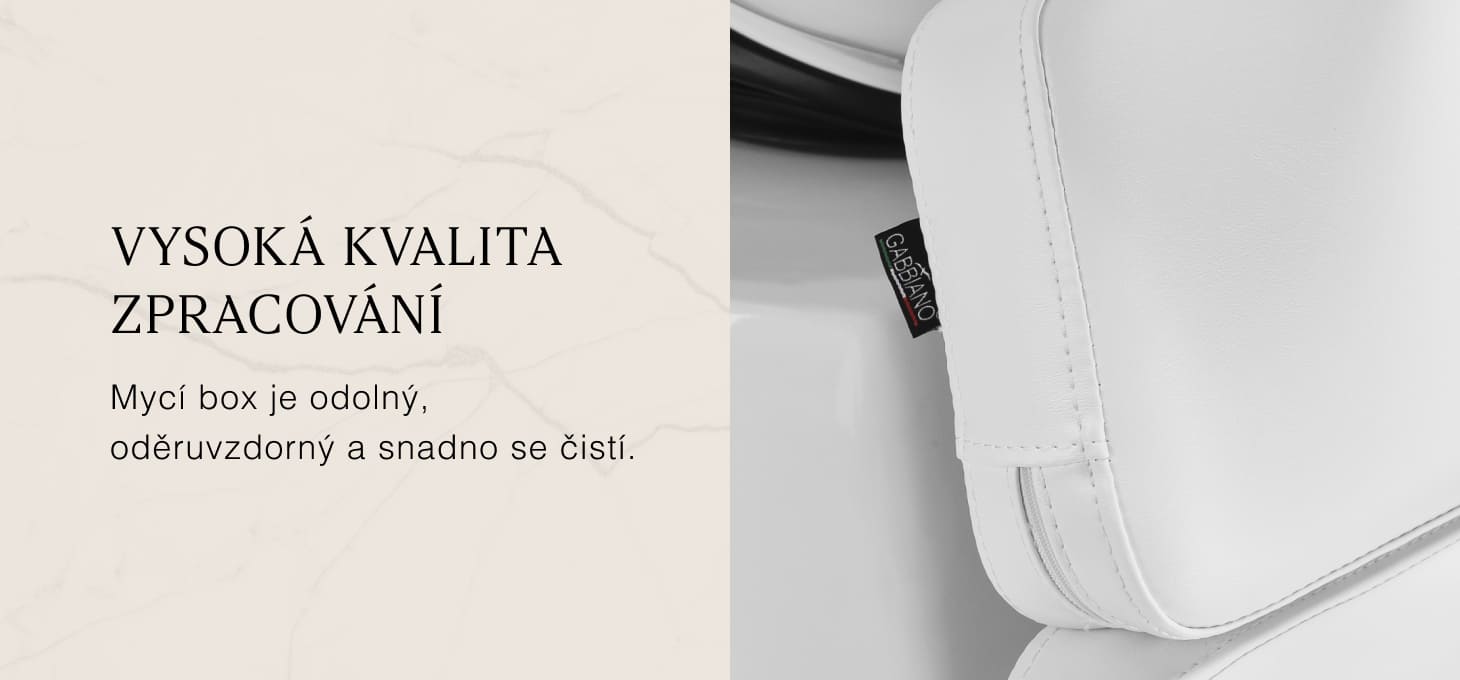 Profilované křeslo poskytuje správnou bederní oporu, a tím i vysoký komfort používání. Kovové područky v odstínech šedé barvy s geometrickým tvarem umožňují správné polohování ramen klienta. Výplň z odolné pěny odolné proti deformaci a čalounění z na dotek příjemné syntetické kůže v odstínech bílé zajišťují odolnost nábytku, snadné čištění a pohodlné používání po dlouhou dobu. Originální, elegantní design myčky dodává interiérům jedinečný nádech. Součástí balení je kompletní příslušenství v odstínech černé barvy, včetně baterie, sprchové hlavice a vyhrazených hadic, které vám poskytnou kompletní sadu nástrojů pro vaši práci.