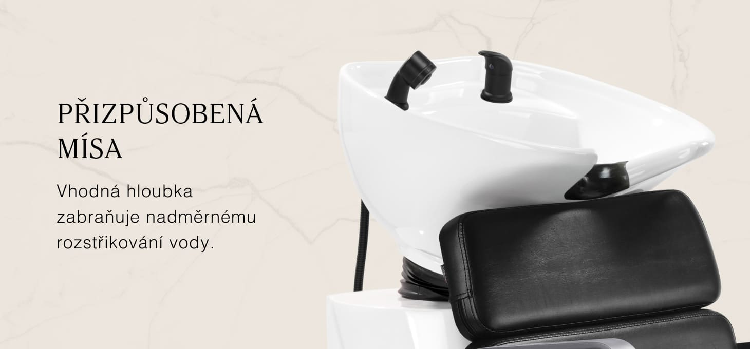 Dostatečná hloubka bílého keramického umyvadla zabraňuje nadměrnému rozstřikování vody nebo přípravků používaných při ošetření. To umožňuje pohodlné a efektivní provádění široké škály služeb. Úhel mísy lze nastavit, což usnadňuje její přizpůsobení. Díky vysoké kvalitě použitých materiálů je mísa odolná, odolná proti skvrnám a poškrábání a velmi snadno se čistí. Vhodně tvarovaná příruba a šikmá opěrka poskytují oporu a pohodlí při mytí vlasů a díky komfortnímu plastovému překrytí v odstínech černé barvy nebude zákazníkovi nepříjemný chlad keramického povrchu.