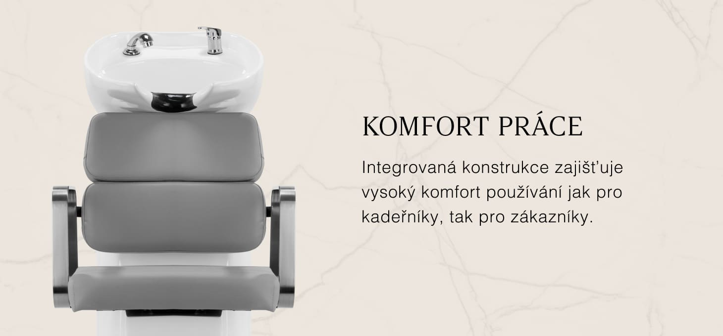 Praktická myčka vlasů je vybavena směšovací baterií, která poskytuje volný přístup k teplé a studené vodě. Díky tomu lze snadno nastavit teplotu podle individuálních preferencí zákazníka. Vyhrazené místo pro odložení sluchátka zefektivňuje práci a chromovaná zátka se speciálním sítkem umožňuje kontrolovat průtok vody a udržovat v salonu vysoké hygienické standardy. Přípojka vody byla umístěna uvnitř základny, což umožňuje efektivní skrytí potrubí. Významnou výhodou tohoto modelu je otvor ponechaný mezi opěradlem a sedákem, který usnadňuje udržování čistoty v salonu a umožňuje snadné vymetení nečistot z každého zákoutí křesla. Myčka je profilována tak, aby zajistila pohodlí při různých ošetřeních a zaručila správnou oporu zad. Díky kombinaci funkčnosti a vybavení je práce v kadeřnickém salonu ještě pohodlnější.