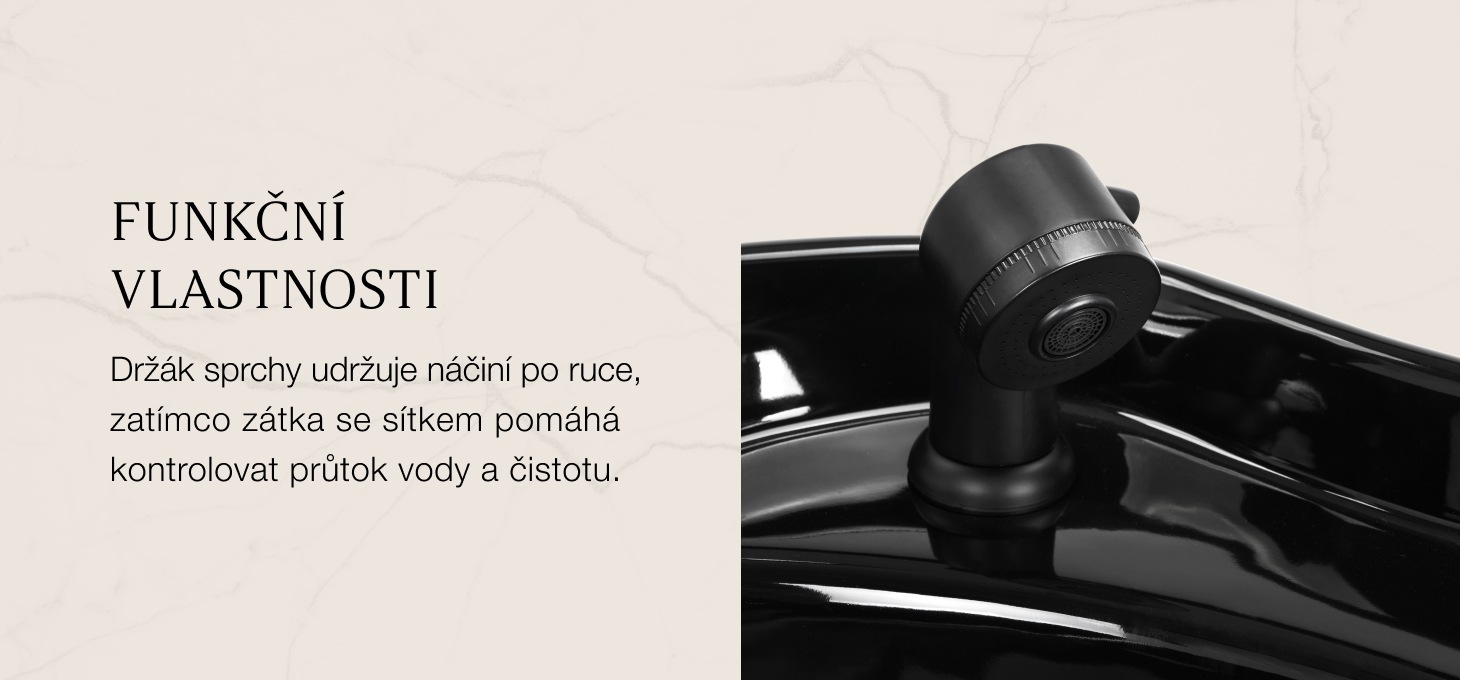 Hluboká keramická mísa v odstínech černé barvy omezuje rozstřikování vody a kosmetických přípravků při provádění procedur, což podporuje pohodlí při práci a udržuje pořádek na pracovišti. Nastavitelný úhel sklonu umyvadla umožňuje přesné přizpůsobení jeho polohy potřebám klienta, čímž zvyšuje ergonomii používání. Umyvadlo je vyrobeno z odolného materiálu, je odolné proti zabarvení, poškrábání a působení chemikálií a jeho hladký povrch usnadňuje udržování čistoty. Ergonomicky tvarovaný límec zajišťuje pohodlnou oporu hlavy, zatímco plastová vložka eliminuje pocit chladu při kontaktu s keramickým povrchem.
