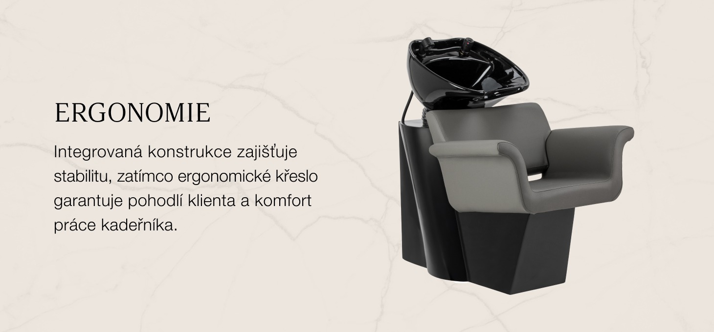 Křeslo spojuje moderní, minimalistický tvar s vysokým komfortem používání. Charakteristicky ven vyklenuté područky mu dodávají elegantní charakter a zároveň podporují pohodlnou a přirozenou polohu klienta. Opěradlo s optimálním úhlem sklonu podporuje správné držení těla a uvolnění během procedur. Použití odolných, vlhkosti odolných materiálů se promítá do snadné údržby a umožňuje zachovat estetický vzhled nábytku po dlouhou dobu. Kompletní armatury – baterie, sprchová hlavice a speciální hadice – zajišťují plnou připravenost pracoviště k provozu. Díky univerzálnímu designu se tento model skvěle hodí jak do moderních, tak i klasických interiérů a podtrhuje profesionální charakter salonu.