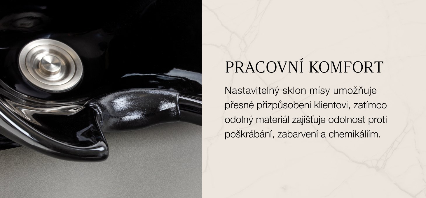 Hluboká keramická mísa v odstínech černé barvy omezuje rozstřikování vody a kosmetických přípravků při provádění procedur, což podporuje pohodlí při práci a udržuje pořádek na pracovišti. Nastavitelný úhel sklonu umyvadla umožňuje přesné přizpůsobení jeho polohy potřebám klienta, čímž zvyšuje ergonomii používání. Umyvadlo je vyrobeno z odolného materiálu, je odolné proti zabarvení, poškrábání a působení chemikálií a jeho hladký povrch usnadňuje udržování čistoty. Ergonomicky tvarovaný límec zajišťuje pohodlnou oporu hlavy, zatímco plastová vložka eliminuje pocit chladu při kontaktu s keramickým povrchem.
