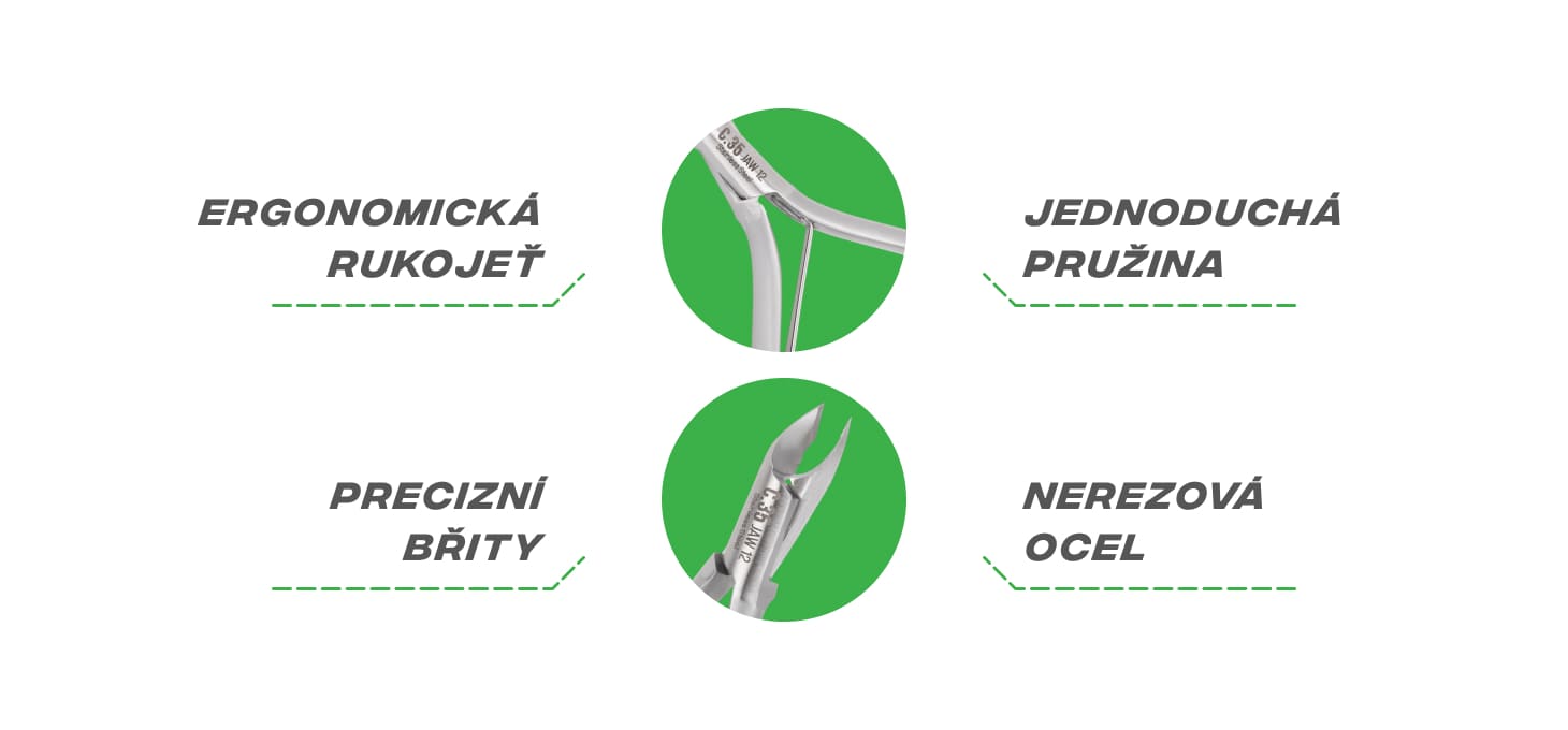 Jednoduchá pružina spojuje ramena kleštiček a zajišťuje cit a přesnost střihu. Pečlivé zpracování umožňuje komfortní, tichou a plynulou práci. Vhodné tvarování a optimální velikost ramen zajišťují, že kleštičky stabilně sedí v ruce a poskytují pohodlí i při delších ošetřeních. Matná povrchová úprava podtrhuje elegantní charakter nástroje a zároveň zajišťuje odolnost a snadné čištění. Díky tomu jsou kleštičky vhodné jak pro profesionální použití, tak pro domácí péči o nehty.