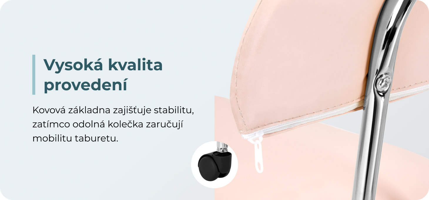 Pětihvězdičková základna ve chromých tónech je vybavena kolečky, která zajišťují značnou mobilitu a usnadňují pohyb nábytku po kanceláři. Čalounění stoličky je vyrobeno z na dotek příjemné imitace kůže v růžových odstínech. Díky použití takového materiálu je stolička trvanlivá, odolná vůči vlhkosti a snadno se čistí.