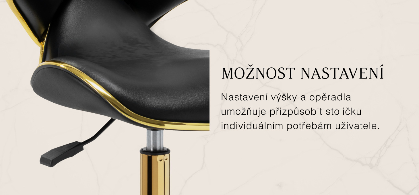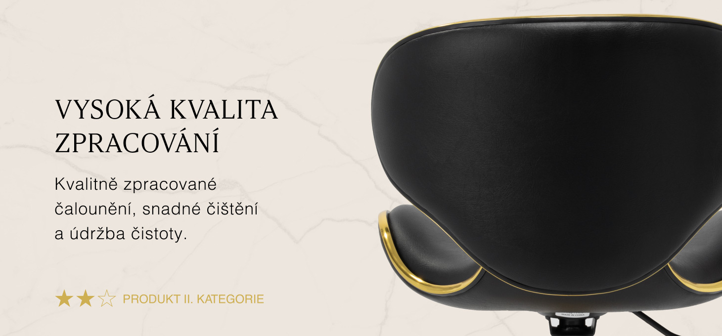 Pětihvězdičková základna zajišťuje stabilitu i při dynamičtějších pohybech nebo častých změnách polohy. Je vybavena robustními kolečky, která zajišťují vysokou mobilitu a umožňují volný pohyb po obývacím pokoji nebo kanceláři. Čalounění ze syntetické kůže v odstínech černé barvy, které je nejen odolné, ale také se snadno udržuje v čistotě. Estetické zlaté prvky dodávají luxusní nádech a upoutají pozornost. Jedinečná kombinace elegance a pohodlí dělá ze stoličky nepostradatelný pracovní nástroj každého profesionála.