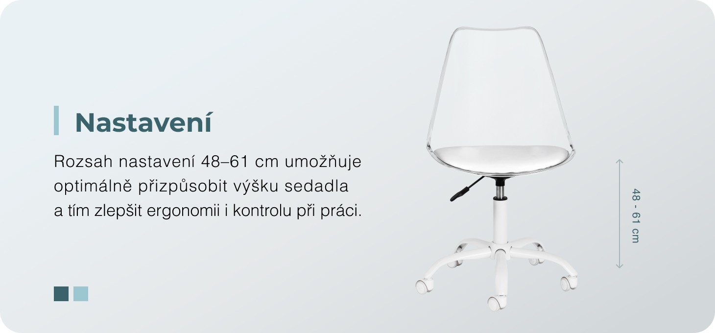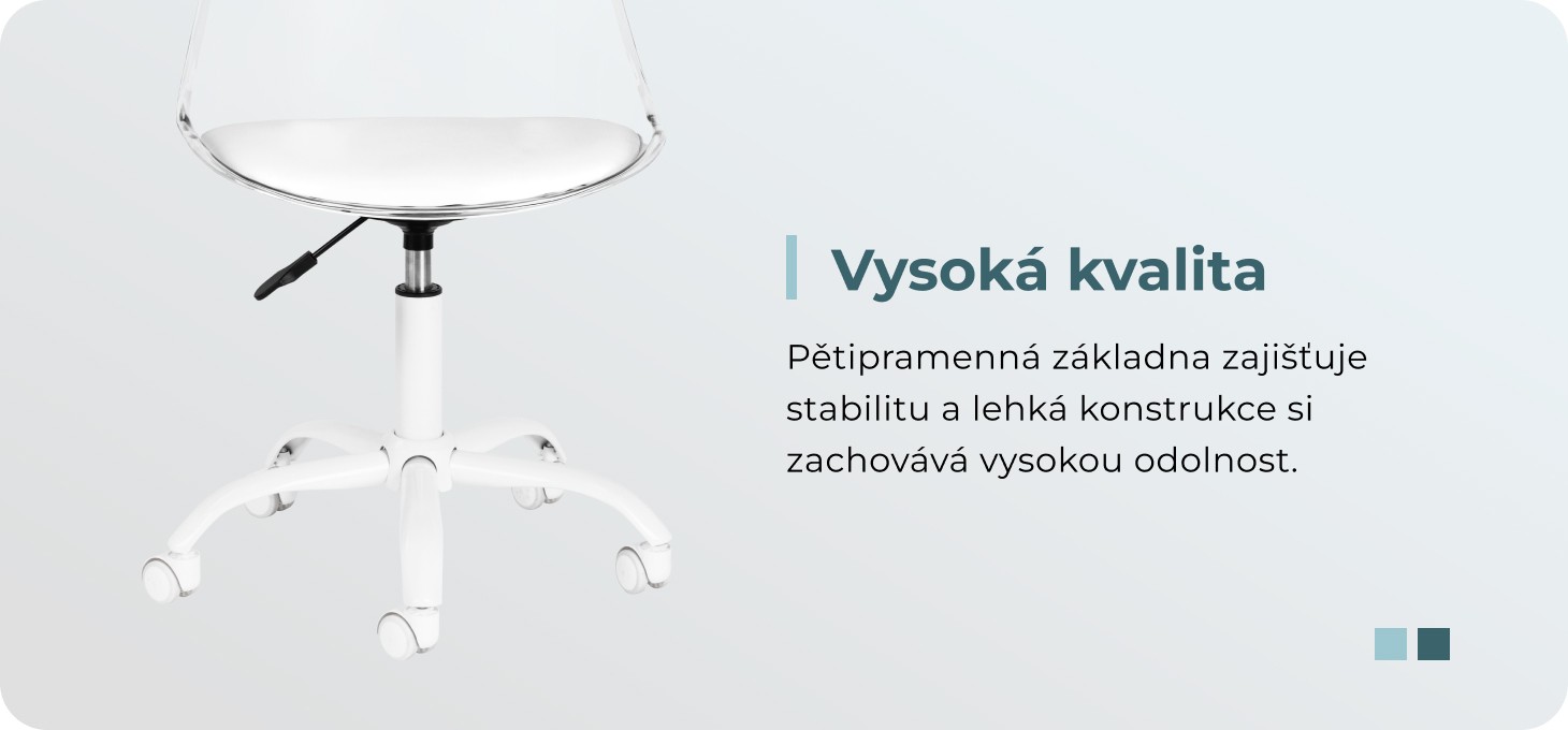 Model upoutá pozornost nápadným průhledným opěradlem, které dodává celku lehký a moderní charakter. Kombinace průhledné konstrukce se sedákem čalouněným bílou syntetickou kůží a bílou základnou vytváří sofistikovaný kontrast, který podtrhuje eleganci. Díky tomu je židle nejen funkčním kusem nábytku, ale také stylovou ozdobou kanceláře. Skvěle se hodí do každého interiéru a dokonale zapadá do estetiky současných kosmetických salonů.