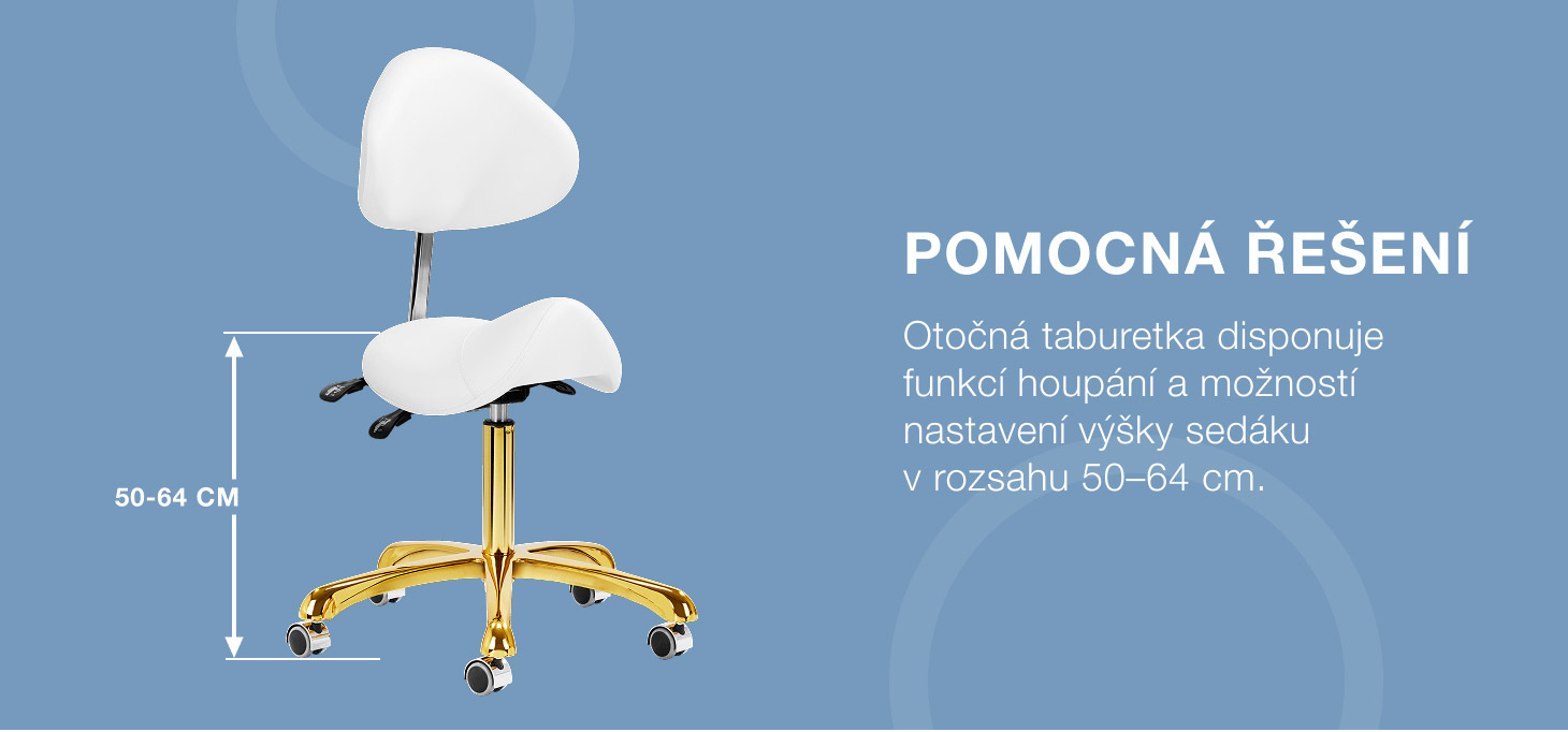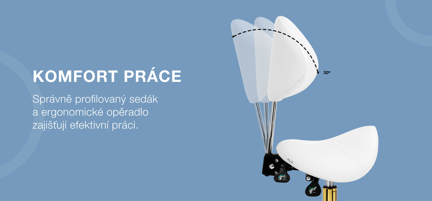 Možnost nastavení výšky sedáku v rozmezí 50-64 cm umožňuje specialistovi zaujmout při provádění výkonů vhodnou polohu. Tvarované opěradlo, které lze prodloužit o 20 cm, poskytuje vynikající oporu zad bez ohledu na výšku uživatele. Plně otočný mechanismus zefektivňuje a zpříjemňuje práci. Židle má také funkci uzamykatelné kolébky pro ergonomické polohování těla při práci. Sedadlo, které má tvar sedla a je vyplněno nedeformovatelnou pěnou, zaručuje uživatelům pohodlí a ergonomické pracovní podmínky.