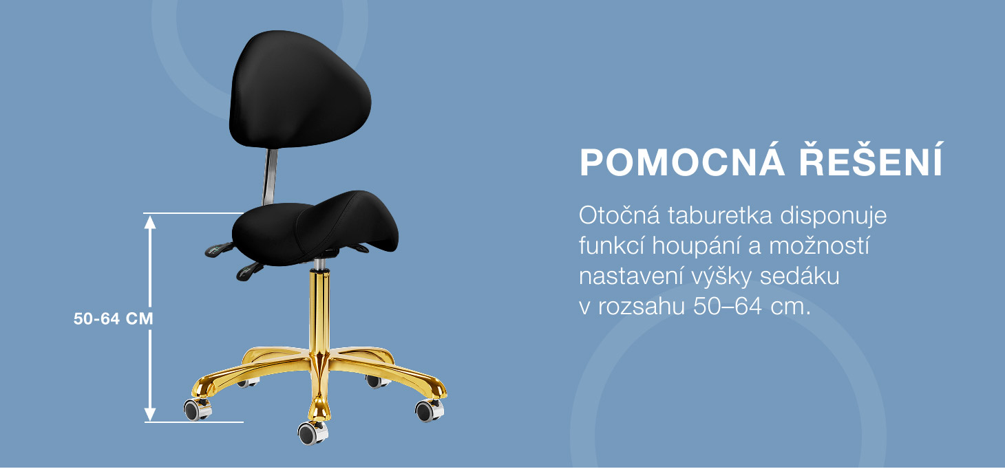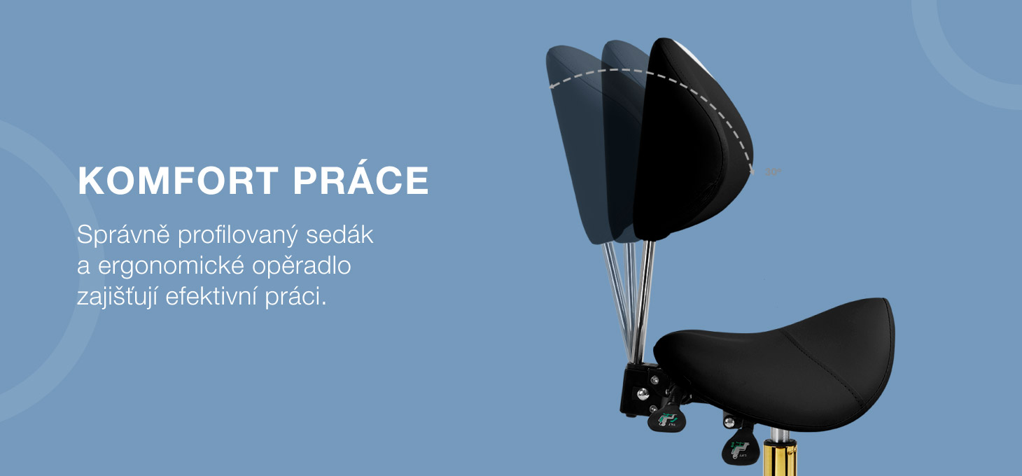 Možnost nastavení výšky sedáku v rozmezí 50-64 cm umožňuje specialistovi zaujmout při provádění výkonů vhodnou polohu. Tvarované opěradlo, které lze prodloužit o 20 cm, poskytuje vynikající oporu zad bez ohledu na výšku uživatele. Plně otočný mechanismus zefektivňuje a zpříjemňuje práci. Židle má také funkci uzamykatelné kolébky pro ergonomické polohování těla při práci. Sedadlo, které má tvar sedla a je vyplněno nedeformovatelnou pěnou, zaručuje uživatelům pohodlí a ergonomické pracovní podmínky.
