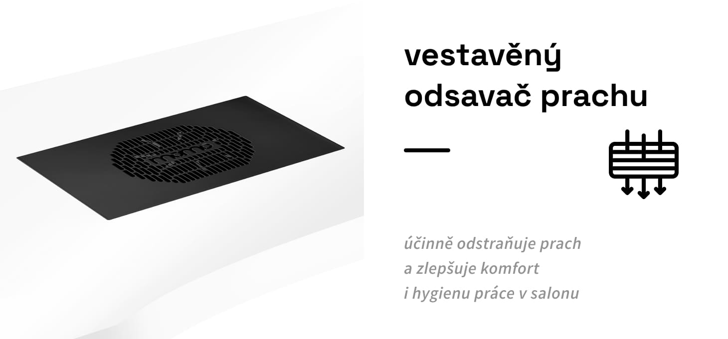 Kazetový pohlcovač prachu Momo J-02 zabudovaný do desky výrazně zvyšuje pracovní komfort a hygienu, protože účinně odstraňuje prach vznikající při kosmetických procedurách, jako je například manikúra. Díky tomuto zařízení zůstává vzduch v salonu čistý a pracovní plocha neznečištěná, což zvyšuje bezpečnost kosmetičky i klientů. Pohlcovač prachu se snadno používá a udržuje, což dále zvyšuje jeho funkčnost. Pravidelné čištění a výměna filtru zajišťují trvale vysokou účinnost pohlcování. Další náhradní filtry lze dokoupit (SKU 123581).