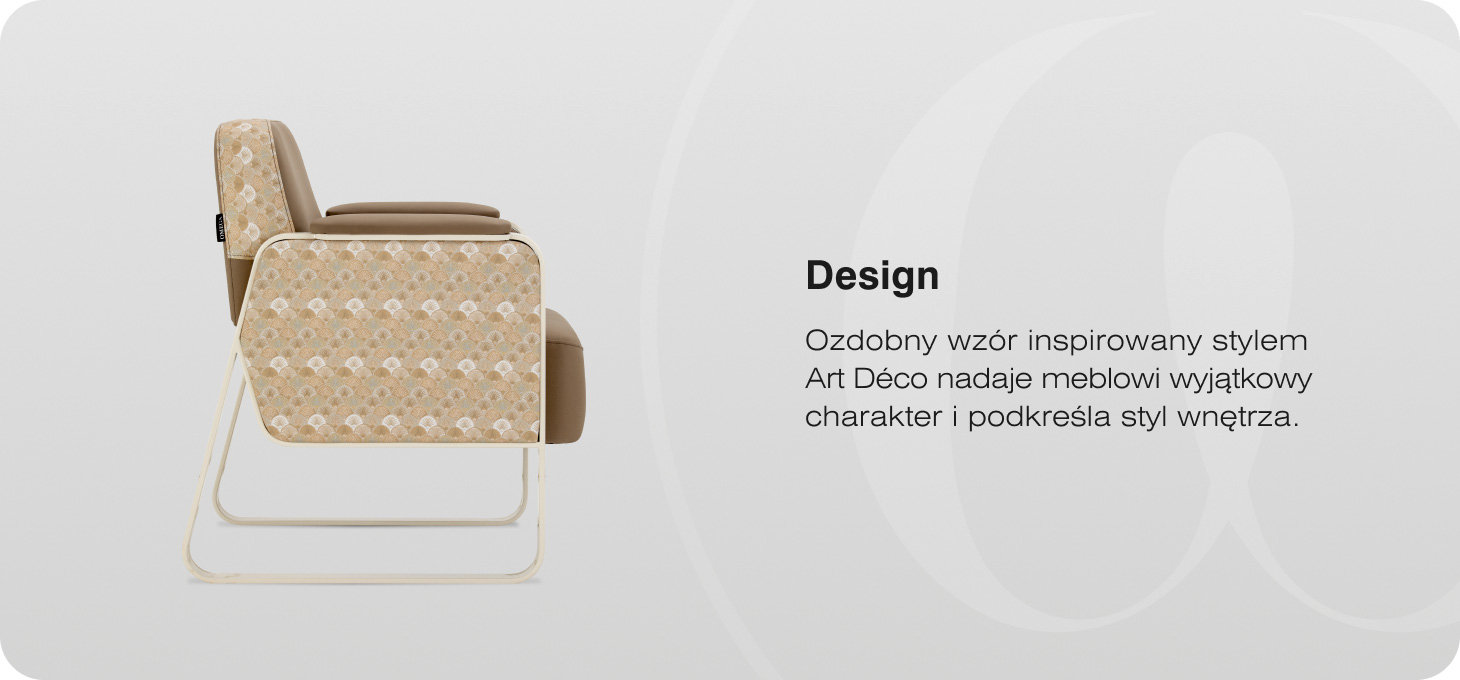 Křeslo je vyrobeno z odolné syntetické kůže v elegantní světle hnědé barvě. Potahový materiál se vyznačuje odolností proti vlhkosti a snadnou údržbou, díky čemuž si nábytek dlouho zachovává estetický vzhled. Stabilní kovová konstrukce ve světlém odstínu dokonale ladí s barevností čalounění. Ozdobný vzor vnější části, inspirovaný stylem Art Déco, dodává nábytku výjimečný charakter a přitahuje pozornost, čímž podtrhuje styl interiéru.