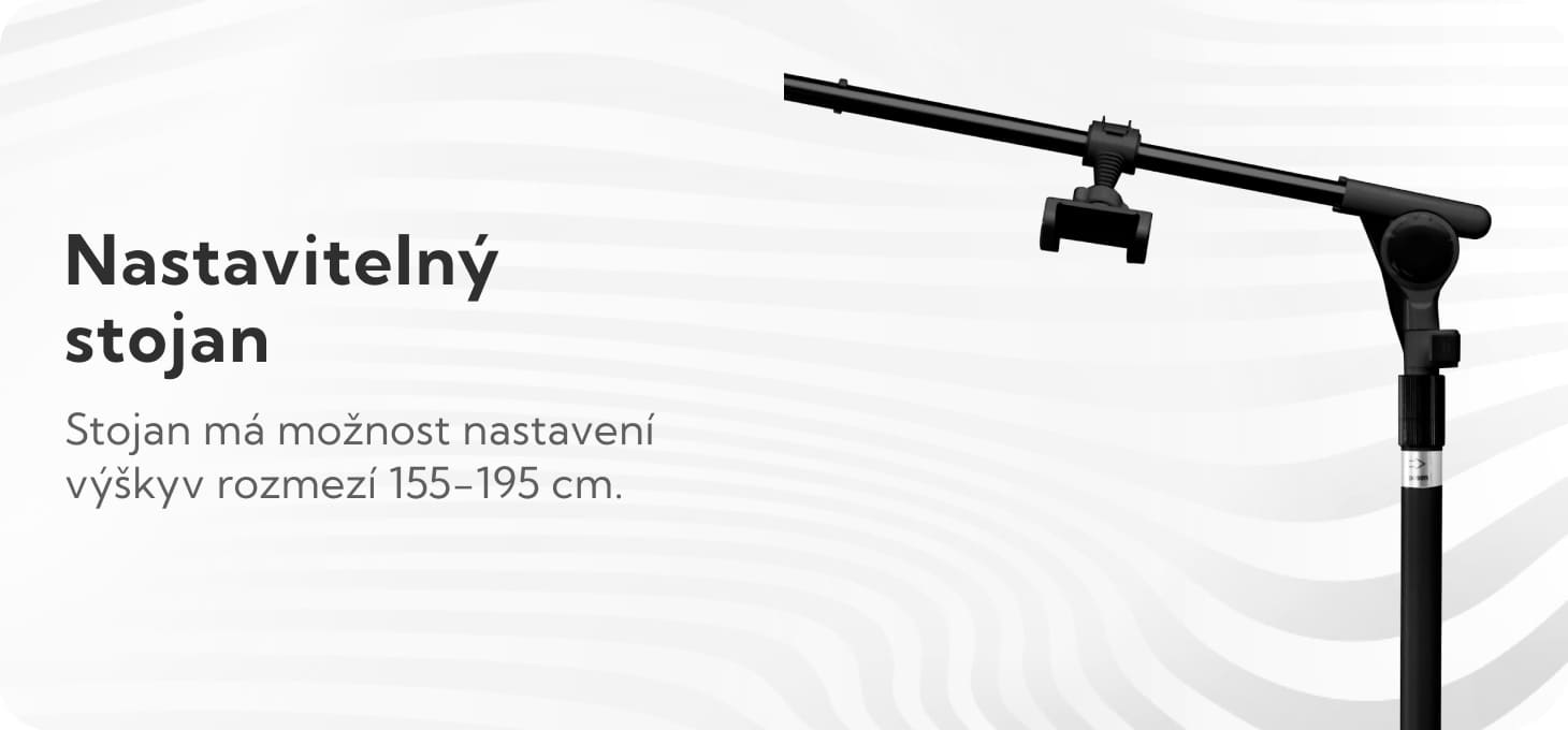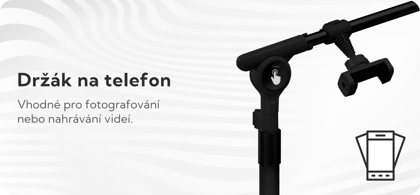 Součástí balení: lampa, součásti stativu, podstavec, držák telefonu, bezdrátové dálkové ovládání, napájecí zdroj a kabel, návod.