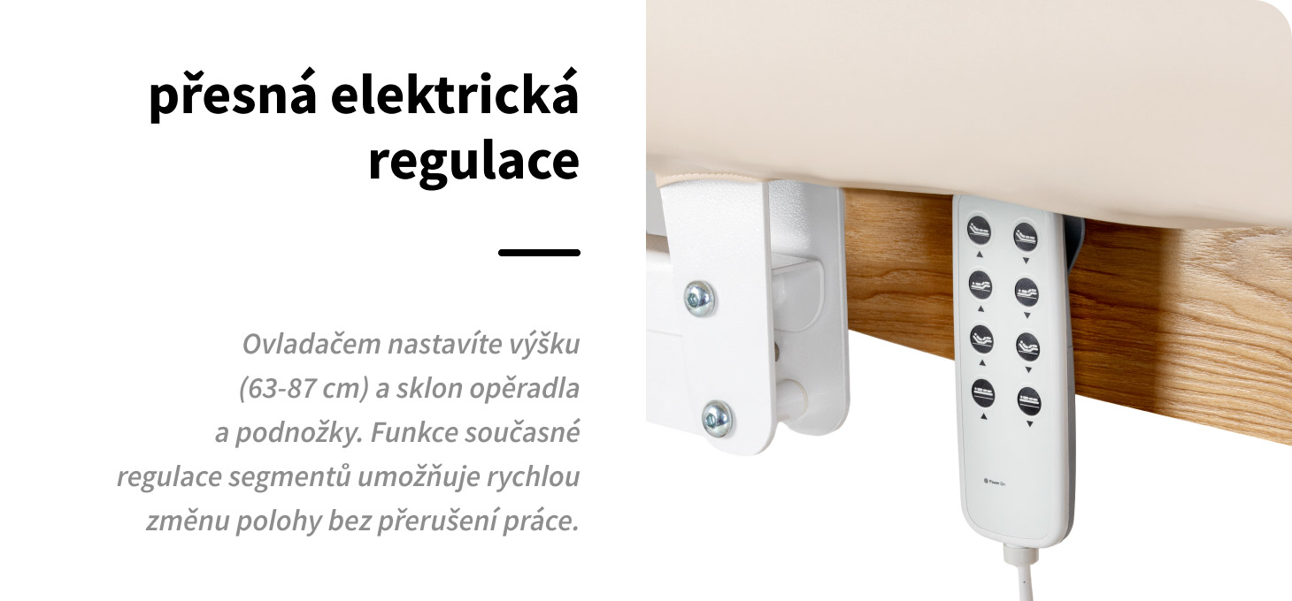 Lehátko je vybaveno elektrickým nastavením výšky v rozmezí 63–87 cm a úhlu sklonu opěradla a nožní části, což umožňuje přesně přizpůsobit polohu typu prováděného zákroku. Široký rozsah nastavení usnadňuje zaujetí ergonomické pracovní polohy, nezávisle na výšce odborníka nebo specifikách procedury. Ovládání se provádí pomocí praktického dálkového ovladače, jehož přehledně označené tlačítka umožňujíintuitivní ovládání všech funkcí, což se promítá do pohodlí obsluhy a plynulosti práce v salonu. Současné nastavení opěradla a podnožky jedním tlačítkem umožňuje okamžitě nastavit polohu vsedě, v pololehu nebo vleže – bez přerušení zákroku. Plynulá změna nastavení podporuje ergonomii práce a zvyšuje komfort klienta v každé fázi zákroku.