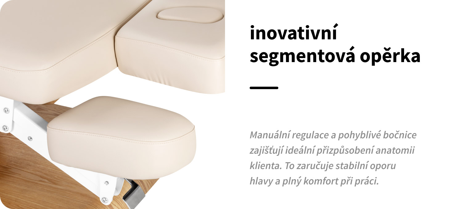 Opěrka hlavy byla navržena s ohledem na maximální pohodlí klienta a funkčnost práce odborníka. Hlavní část je nastavitelná ručně, což umožňuje nastavit optimální polohu opory hlavy, zatímco boční segmenty se pohybují nahoru a dolů a přizpůsobují se individuální anatomii hlavy a krku klienta. Toto řešení zajišťuje pohodlné uložení během procedur, udržuje správnou polohu a zvyšuje komfort jak klienta, tak osoby provádějící proceduru.
