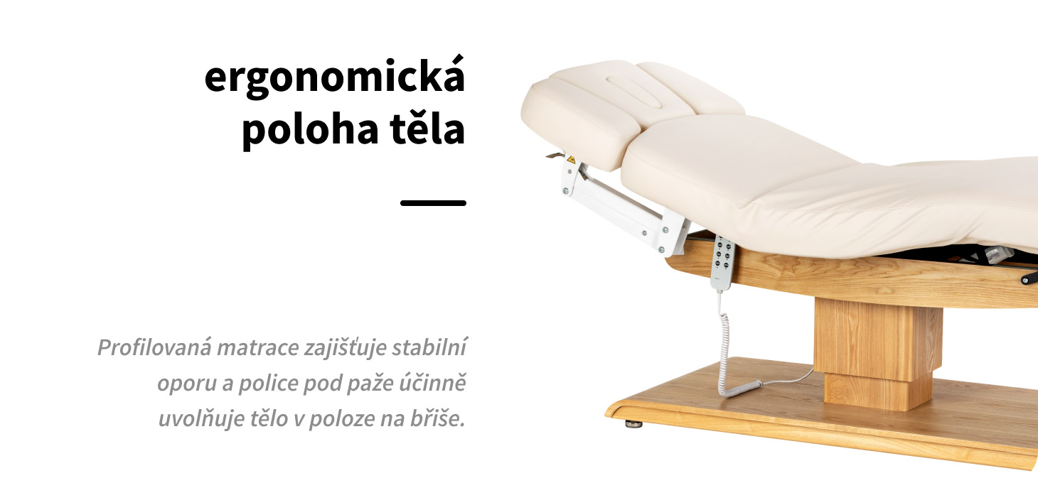 Profilovaná povrch ošetřovacího lehátka podporuje přirozené polohování těla a zajišťuje stabilní a pohodlnou oporu po celé délce. Vhodná šířka a měkká matrace zvyšují pohodlí klienta, zejména při delších procedurách. Větší pohodlí znamená lepší zážitek z procedury a vyšší standard služeb v salonu. Dodatečná polička pod paže zvyšuje pohodlí v poloze na břiše, odlehčuje horní část těla a podporuje úplné uvolnění.