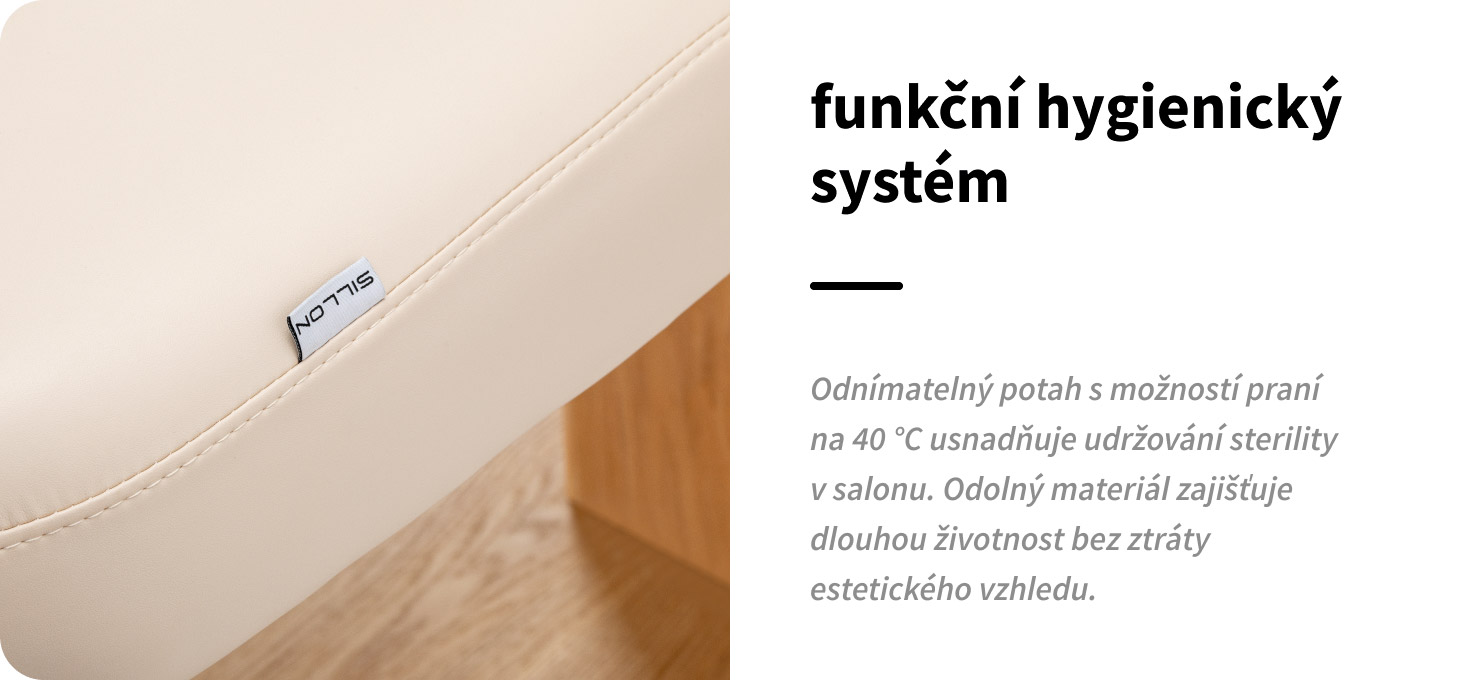 Snímatelný potah matrace je skutečným usnadněním každodenní práce. Možnost rychlého sejmutí a vyprání (ručně nebo v pračce do 40 °C) umožňuje snadno udržovat vysoký standard hygieny v salonu. Krátké sušení při nízké teplotě urychluje opětovnou přípravu pracoviště k práci. Správná péče bez použití alkoholu a silných čisticích prostředků pomáhá zachovat estetický vzhled a trvanlivost materiálu po delší dobu.