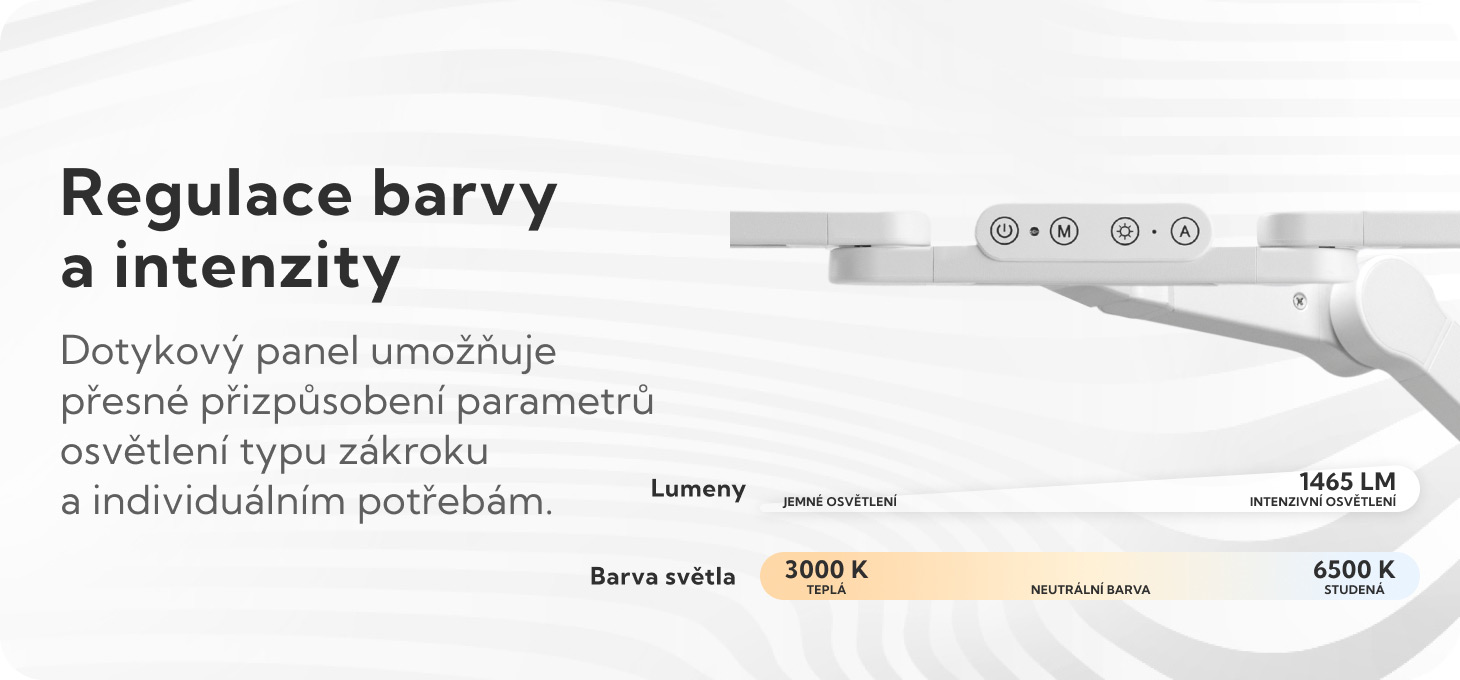 Možnost přizpůsobení barvy a intenzity světla zajišťuje dokonalé zobrazení barev, což snižuje únavu očí při dlouhodobé práci. Barvu a intenzitu světla lze postupně upravovat pomocí dotykového panelu umístěného na hlavě. Nastavení zahrnuje pět úrovní barevné teploty (od studené přes neutrální až po teplou) a pět úrovní intenzity světla. Po delším podržení tlačítek je také možné plynulé nastavení, což nabízí obrovské možnosti přizpůsobení osvětlení individuálním potřebám. Lampa je také vybavena světelným senzorem, který umožňuje automatické přizpůsobení intenzity osvětlení jasu okolí, což dále zvyšuje komfort práce.