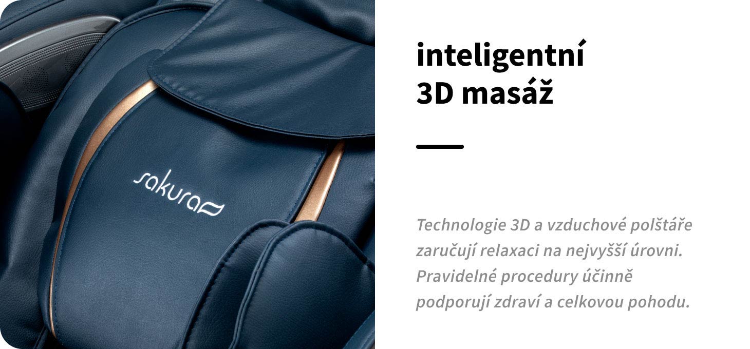 Masážní křeslo Sakura Maximus 809 s pokročilou 3D masáží zajišťuje komplexní relaxaci a vysoký komfort použití. Promyšlené funkce zajišťují intenzivní, relaxační masáž. Inteligentní systém detekce těla, 3D technologie, precizně fungující masážní hlavice a systém vzduchových polštářů zajišťují účinné uvolnění svalů, hlubokou relaxaci a zklidnění. Ideální řešení jak pro aktivní osoby, tak pro ty, kteří tráví mnoho hodin v sedě, nabízí každodenní dávku relaxace na nejvyšší úrovni. Pravidelné masážní sezení podporují krevní oběh, pomáhají snižovat svalové napětí a únavu a účinně snižují úroveň stresu, což má pozitivní vliv na každodenní pohodu a kvalitu života.