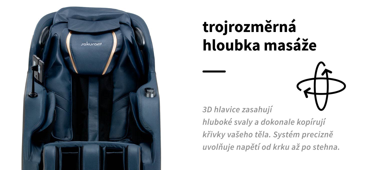 Technologie 3D masáže umožňuje přesné napodobení pohybů lidských rukou a zajišťuje intenzivní a vysoce účinnou masáž. Čtyři masážní hlavy pracují ve třech rozměrech – pohybují se nahoru a dolů, dopředu a dozadu a do hloubky svalové tkáně. Takový účinek umožňuje přesné přizpůsobení masáže přirozeným křivkám těla a potřebám uživatele, čímž účinně uvolňuje napnuté svaly. Díky tomu je možné přesně promasírovat všechny části zad – od krku přes lopatky až po dolní část zad a horní část stehen – což se promítá do výrazného snížení napětí a znatelného zlepšení pohodlí.