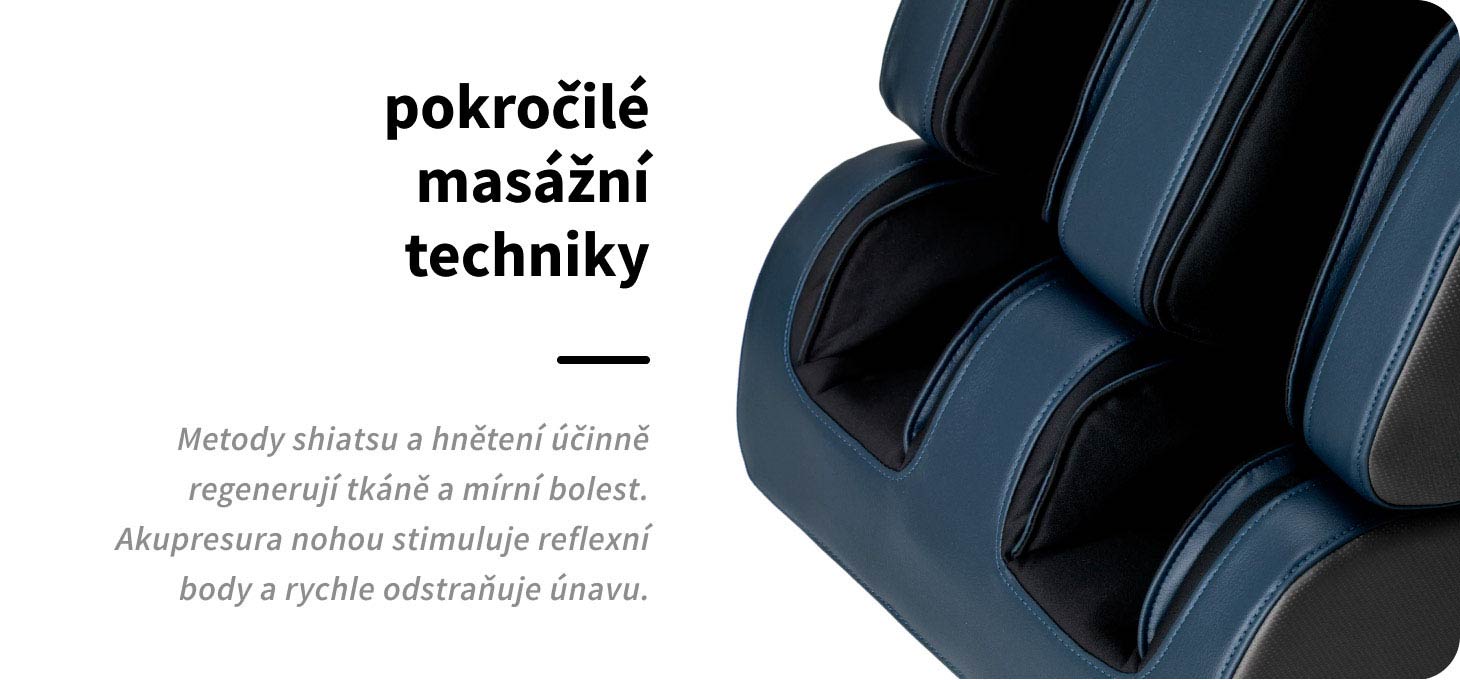 Použité masážní technologie jsou založeny na precizně vybraných a vzájemně se doplňujících technikách, jako je hnětení (kneading), klepání (knocking), poklepávání (tapping) a shiatsu. Jejich různé kombinace umožňují účinné zpracování svalové tkáně, podporují přirozené regenerační procesy organismu a pomáhají snižovat napětí a bolestivé potíže. Vestavěný masážní přístroj na chodidla navíc využívá techniku akupresury a působí na klíčové reflexní body. Přesný tlak napomáhá hlubokému uvolnění a účinně snižuje pocit únavy nohou.