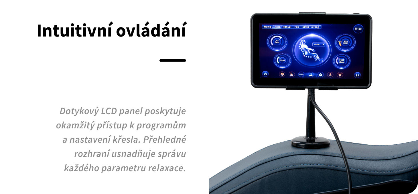 Ovládací panel umožňuje snadné přizpůsobení masáže individuálním potřebám. Pro větší pohodlí jej lze umístit do držáku na pravém područce nebo držet v rukou. Na displeji jsou jasně zobrazeny všechny důležité informace – aktuálně masírované části těla, intenzita masáže, délka trvání sezení a vybraný program. Panel umožňuje přepínat mezi automatickými a manuálními režimya zapínat hlasové ovládání, což zvyšuje komfort obsluhy. Pomocí něj můžete pohodlně vybírat z dostupných masážních režimů, regulovat intenzitu, přizpůsobovat nastavení křesla a přesně nastavovat délku sezení v 5minutových intervalech (5, 10, 15, 20, 25 nebo 30 minut), což zajišťuje ideální délku masáže přizpůsobenou potřebám uživatele.