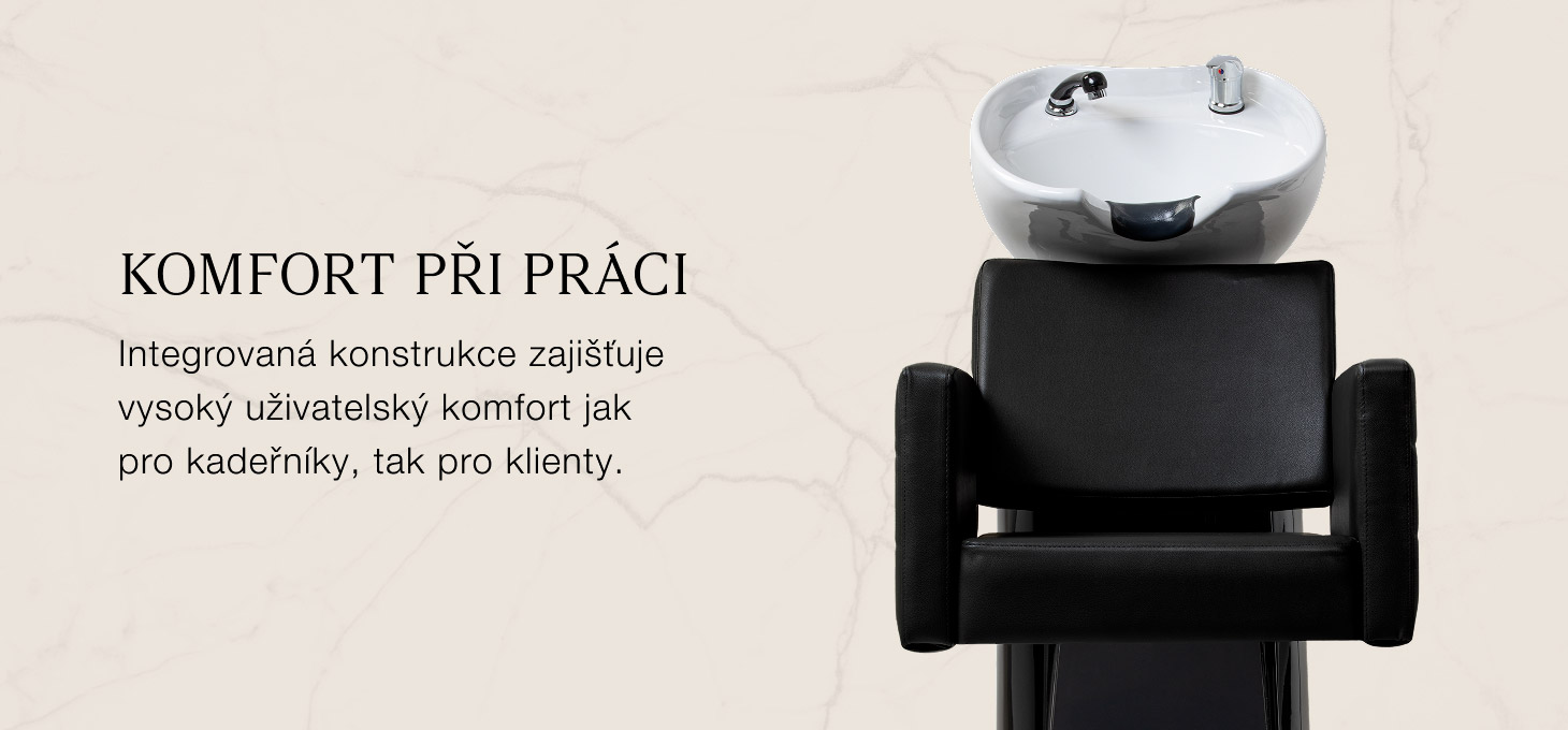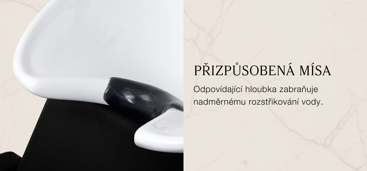 Hluboká keramická mísa v odstínech bílé účinně omezuje rozstřikování vody a přípravků používaných při ošetření. To podporuje pohodlné a přesné provádění nejrůznějších kadeřnických služeb. Pohyblivá konstrukce mísy umožňuje snadné nastavení úhlu podle individuálních potřeb. Použitý materiál je trvanlivý, odolný proti odbarvení a poškrábání a snadno se udržuje v čistotě. Vhodně tvarovaná příruba poskytuje pohodlnou oporu hlavě při mytí, zatímco komfortní plastový překryt v černých tónech eliminuje pocit chladu keramického povrchu.