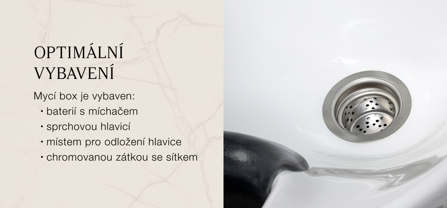 Myčka je vybavena směšovací baterií pro pohodlné ohřívání teplé a studené vody a snadné nastavení teploty. Praktické místo pro odložení sprchové hlavice usnadňuje organizaci práce a udržování pořádku na pracovišti. Zátka se sítkem umožňuje regulovat průtok vody při zachování vysokých hygienických standardů. Součástí dodávky je kompletní baterie - baterie, sprchová souprava a vyhrazené hadice, které tvoří sadu připravenou k použití. Vodovodní přípojka byla umístěna uvnitř základny myčky, což umožňuje estetické skrytí instalace. V základně myčky jsou místa pro její přišroubování k zemi - toto řešení zvyšuje stabilitu celé konstrukce. Kombinace funkčních řešení a promyšlených detailů se promítá do komfortu každodenní práce v kadeřnictví.