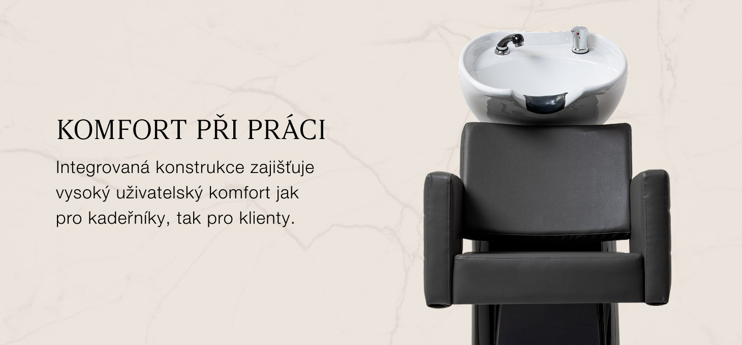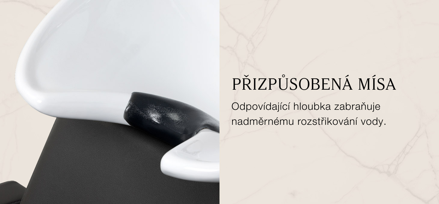 Hluboká keramická mísa v odstínech bílé účinně omezuje rozstřikování vody a přípravků používaných při ošetření. To podporuje pohodlné a přesné provádění nejrůznějších kadeřnických služeb. Pohyblivá konstrukce mísy umožňuje snadné nastavení úhlu podle individuálních potřeb. Použitý materiál je trvanlivý, odolný proti odbarvení a poškrábání a snadno se udržuje v čistotě. Vhodně tvarovaná příruba poskytuje pohodlnou oporu hlavě při mytí, zatímco komfortní plastový překryt v černých tónech eliminuje pocit chladu keramického povrchu.