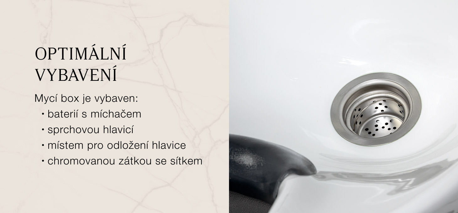 Myčka je vybavena směšovací baterií pro pohodlné ohřívání teplé a studené vody a snadné nastavení teploty. Praktické místo pro odložení sprchové hlavice usnadňuje organizaci práce a udržování pořádku na pracovišti. Zátka se sítkem umožňuje regulovat průtok vody při zachování vysokých hygienických standardů. Součástí dodávky je kompletní baterie - baterie, sprchová souprava a vyhrazené hadice, které tvoří sadu připravenou k použití. Vodovodní přípojka byla umístěna uvnitř základny myčky, což umožňuje estetické skrytí instalace. V základně myčky jsou místa pro její přišroubování k zemi - toto řešení zvyšuje stabilitu celé konstrukce. Kombinace funkčních řešení a promyšlených detailů se promítá do komfortu každodenní práce v kadeřnictví.