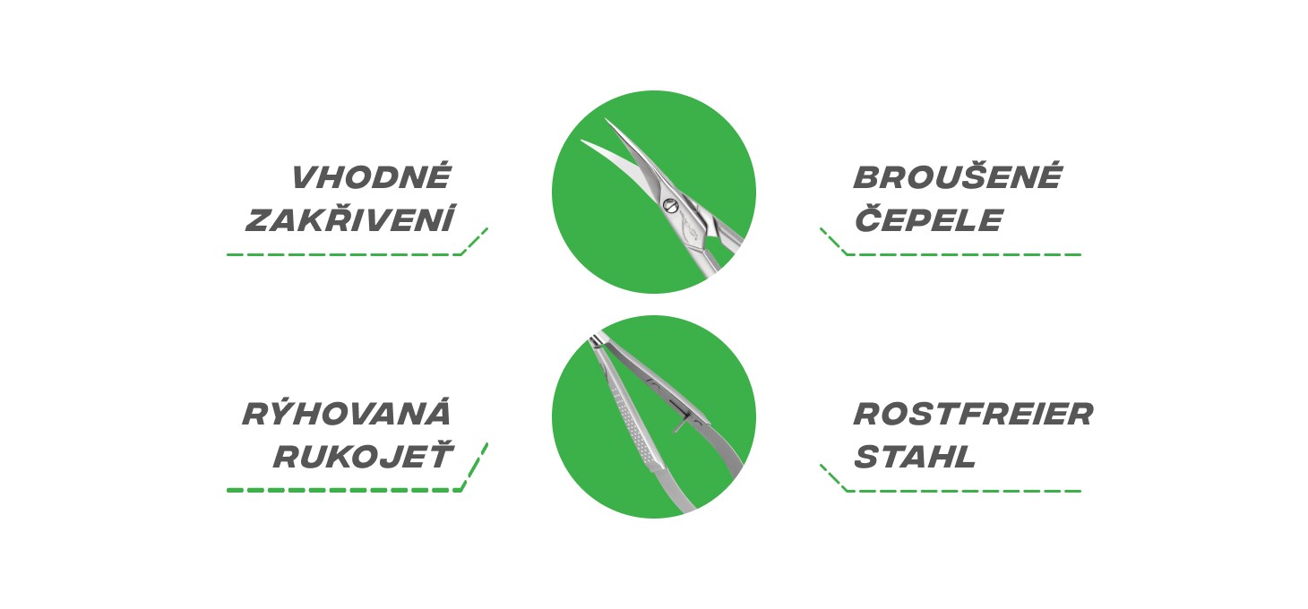 Prodloužené rukojeti s protiskluzovými prvky podporují přirozené postavení ruky a zvyšují komfort při dlouhodobé práci. Nůžky jsou vyrobeny z vysoce kvalitní nerezové oceli, díky čemuž se vyznačují výjimečnou odolností vůči poškození a otupení. Jsou plně přizpůsobeny sterilizaci v autoklávu. Povrchová úprava usnadňuje udržování nástroje v čistotě, což je klíčové pro zachování nejvyšších hygienických standardů. Další výhodou je flexibilní kryt čepelí, který po skončení práce udržuje čepele sepnuté. Díky tomu lze nůžky bezpečně skladovat a zároveň chránit čepele před poškozením a otupením.