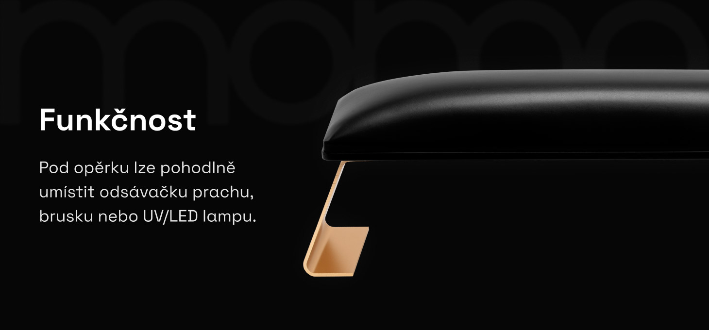 Podpěrka pro manikúru Momo 7-M je nezbytnou součástí vybavení nehtového salonu, která výrazně zlepšuje pohodlí při práci stylistky i komfort zákaznice. Díky vhodným rozměrům umožňuje pohodlné umístění nezbytných zařízení, jako je odsavač prachu, frézka nebo UV/LED lampa. Takové řešení usnadňuje organizaci pracovního místa a zlepšuje jeho ergonomii.