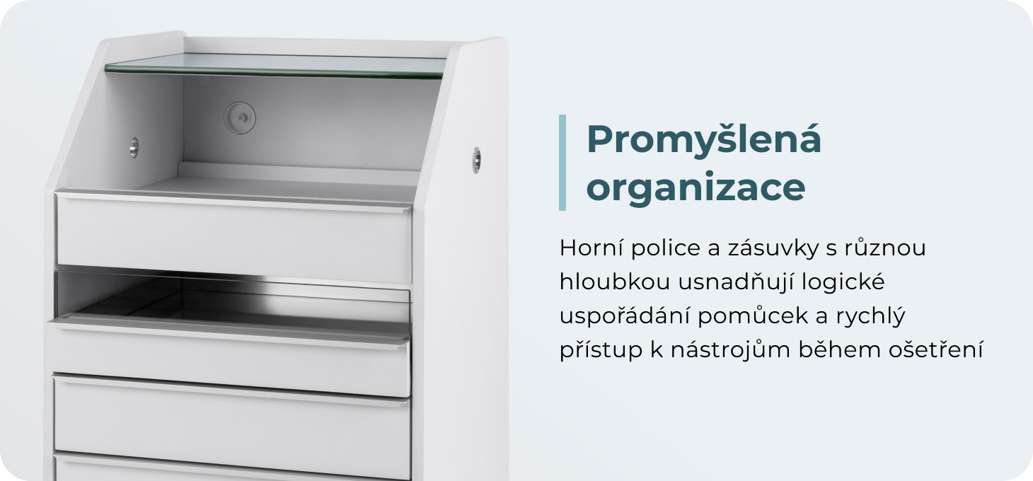 Úzká horní skleněná police umožňuje pohodlné odkládání nejčastěji používaných doplňků. Skříňka je vybavena čtyřmi zásuvkami různých velikostí, což napomáhá přehlednému ukládání nástrojů a kosmetických produktů. Zrcadlové dno jedné ze zásuvek a speciální vnitřní organizér napomáhají lepší organizaci nástrojů, zajišťují rychlý přístup k nezbytným doplňkům a zvyšují komfort práce během procedur. Výška horní otevřené zásuvky umožňuje umístit nezbytná zařízení, jako je frézka s odsavačem.
