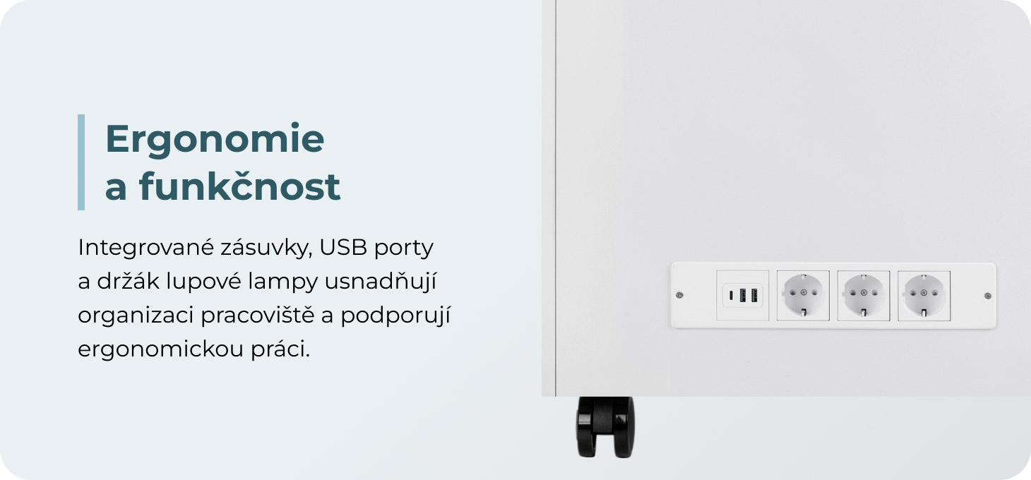 Pomocník má zadní panel se třemi síťovými zásuvkami, dvěma porty USB a jedním portem USB-C, což umožňuje pohodlné připojení různých typů zařízení. Průchodky pro kabely umístěné ve stěnách u horní zásuvky pomáhají udržovat pořádek. Integrovaný držák na lampu s lupou umožňuje stabilní upevnění ramene lampy v blízkosti ošetřovaného místa, aniž by zabíral místo na pracovní desce, což přispívá k přesnému osvětlení a ergonomii práce.